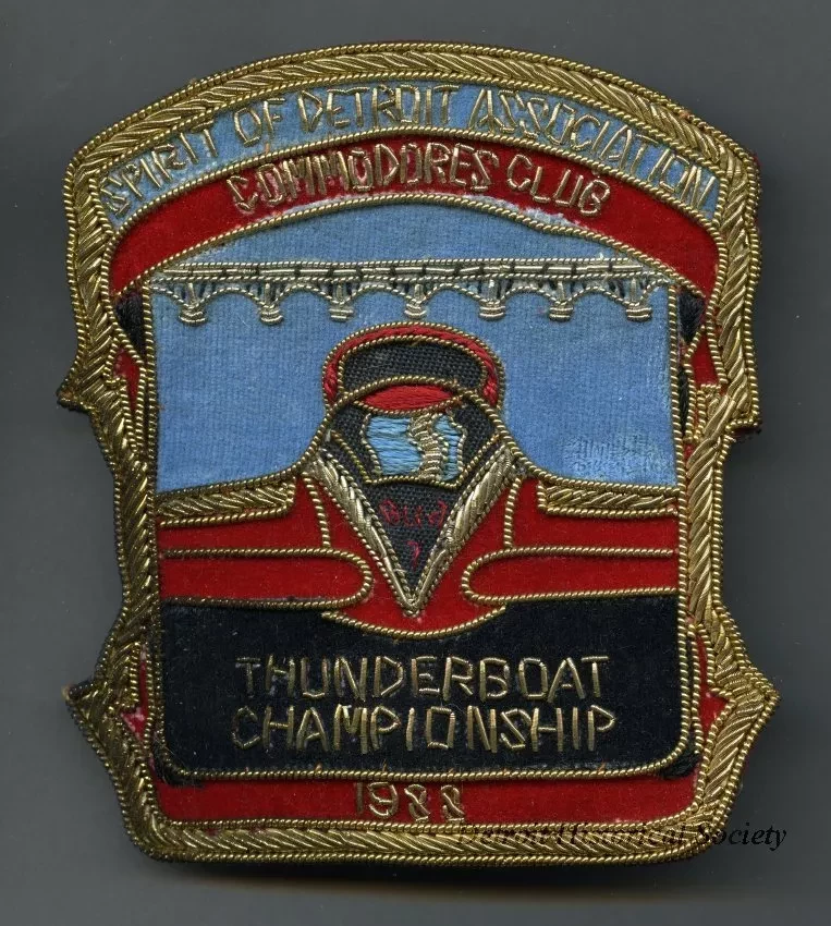 One jacket badge for the "Spirit of Detroit Association Commodores Club." The decorative, shield-shaped badge shows a hydroplane and the Belle Isle Bridge at the center. The images are made of fine thread and gold braid on a red, blue, and black velvet background. Fine gold braid is used for the text and is also used to form a decorative border. Additional text at the bottom of the badge reads "Thunderboat Championship, 1988." The badge has a layer of cardboard at the center with a black fabric backing. The back includes three brass pins with spring clips for attachment to a blazer or jacket. A separate small printed paper card gives handling instructions.