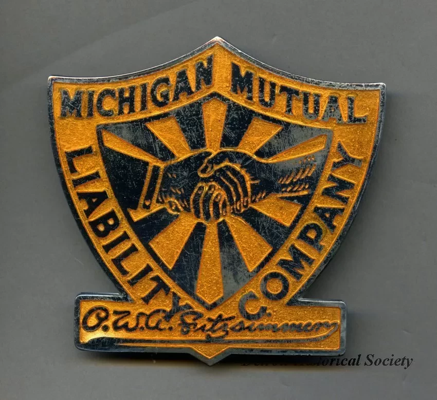 Shield-shaped emblem made of zinc with chrome and orange metallic paint finish on front. Shows image of clasped hands at center with chrome text along edges that reads "Michigan Mutual Liability Company" and "P.W.A. Fitzsimmons." Back is unfinished and has a short threaded stud for attachment at center. Raised text on back shows manufacturer's name as " G. J. Mayer Co., Indianapolis."