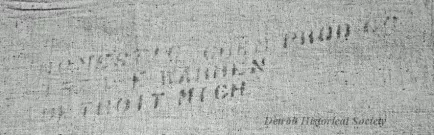 Bag/sack: Flour or bulk material sack. The rectangular sack is made of heavy cotton fabric that has a coarse texture. It has a fold on one of the long sides and is sewn on the opposite long side and one of the short sides. Black text has been stamped on one side. The text is faint and appears to read "Domestic Chem. Prod. Co., 1574 E. Warren, Detroit."