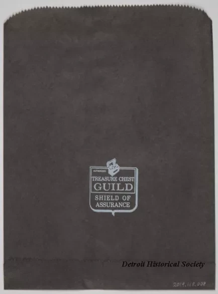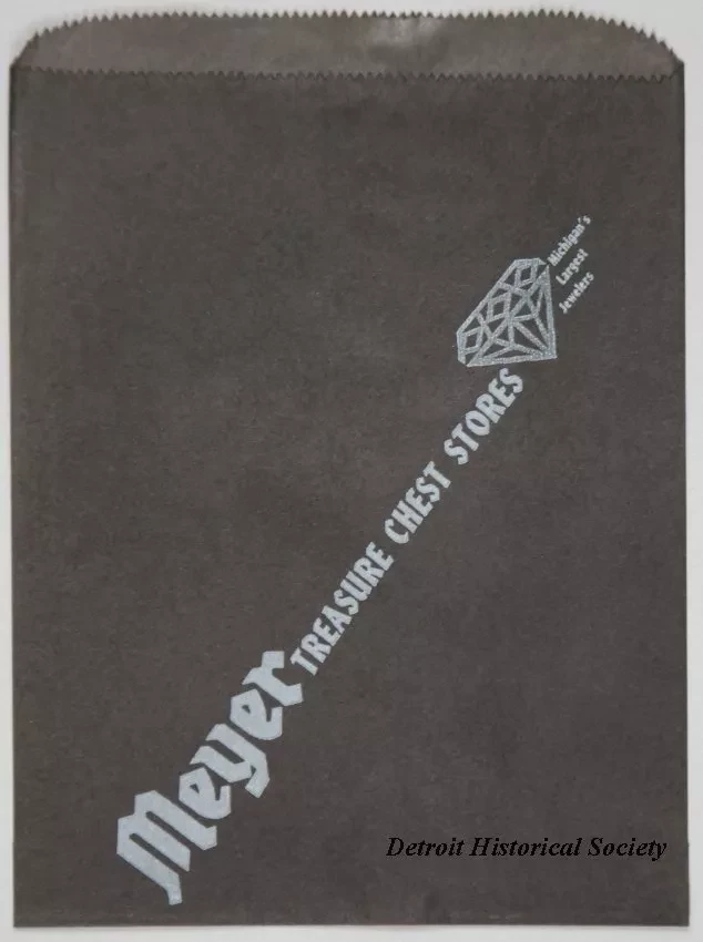 Two small paper bags for merchandise sold from a "Meyer Treasure Chest" jewelry store in Detroit. The flat bags are made of black paper with a folded/glued bottoms and open tops. Silver-colored text on one side reads "Meyer Treasure Chest Stores, Michigan's Largest Jewelers." A silver-colored shield emblem is printed on the other side with text that reads "Treasure Chest Guild, Shield of Assurance."