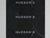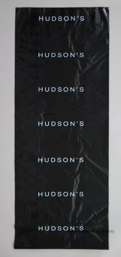 Two "Hudson's" plastic shopping bags. The gusseted, tear-off bags have perforations at 36-inch intervals and have been torn off from a roll of bags. They are made of black plastic and are stamped at regular intervals at the center with white text that reads "Hudson's."