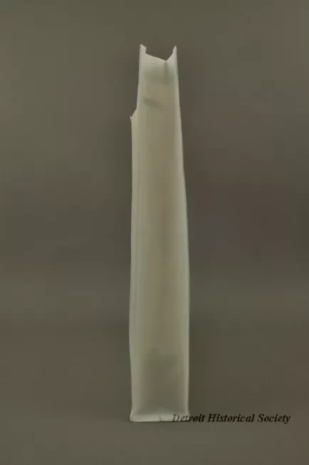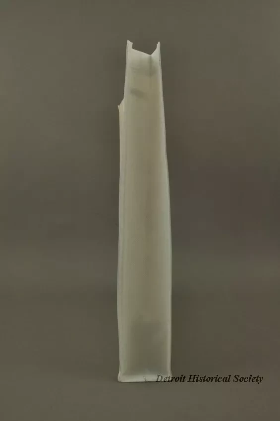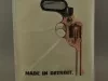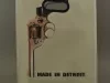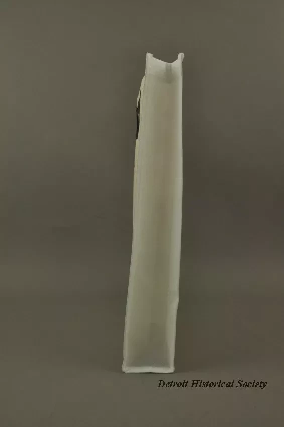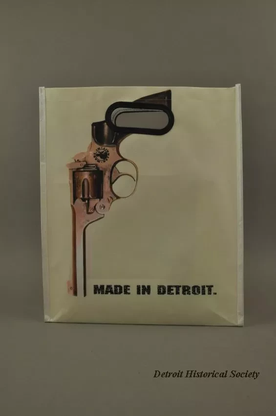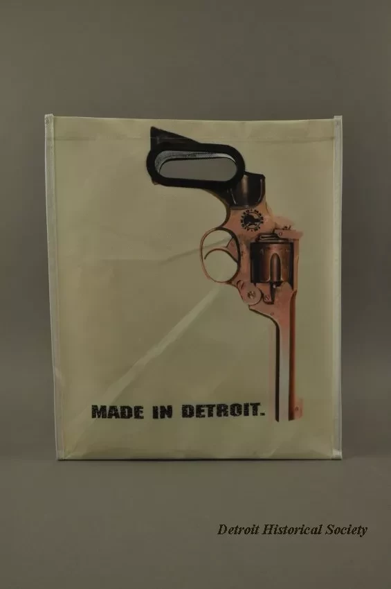 One tote bag from "Made In Detroit." The rectangular bag is made of white and light tan woven polyester fabric. It has a narrow bi-fold bottom with narrow bi-fold side panels that have been stitched along the edges. The large side panels show a picture of a downward-pointed revolver and black lettering that reads "Made In Detroit." Oval-shaped brown plastic handles are stitched in place near the top edge.