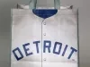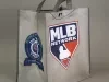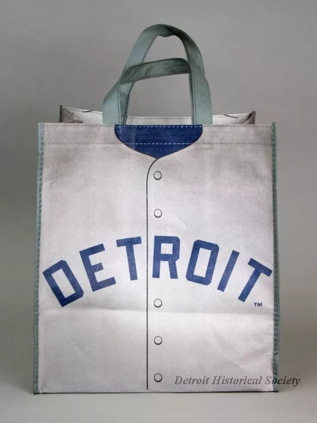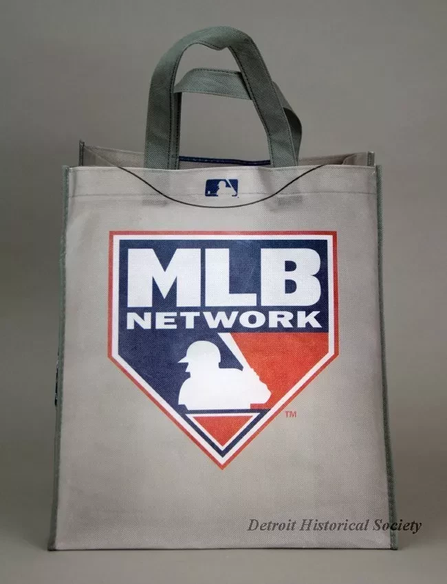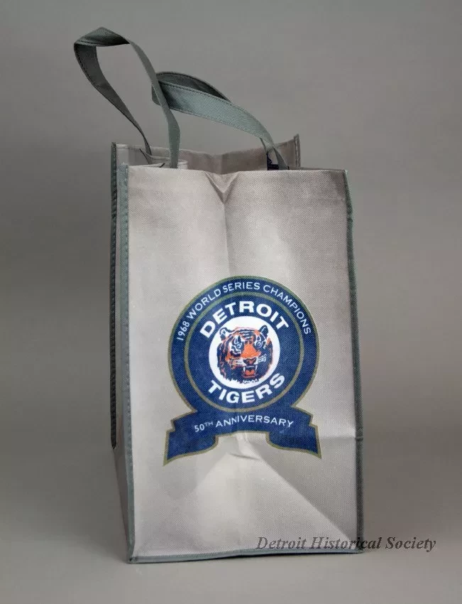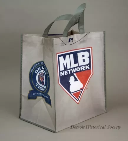 One Detroit Tigers tote bag which commemorates the 50th anniveersary of their 1968 World Series win. The box-shaped bag is made of thin gray polyester fabric. The design on the front of the bag resembles the front of the Detroit Tigers 1968 road jersey. A large red/white/blue "MLB Network" emblem is shown on the back. The creased sides of the bag are both stamped with a large orange/blue/white Detroit Tigers emblem along with white text that reads "1968 World Champions, 50th Anniversary." The bag has two loop handles at the top and a thin black plastic bottom panel on the inside.