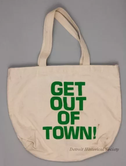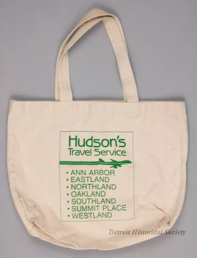 One tote bag from "Hudson's Travel Service." The tote bag is made of heavyweight cotton canvas in an off-white color. It has sewn side seams and two large canvas loop handles. Green printed text on one side of the bag reads "Hudson's Travel Service - Ann Arbor, Eastland, Northland, Oakland, Southland, Summit Place, Westland." Green printed text on the other side reads "Get Out of Town!"