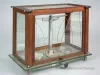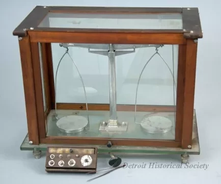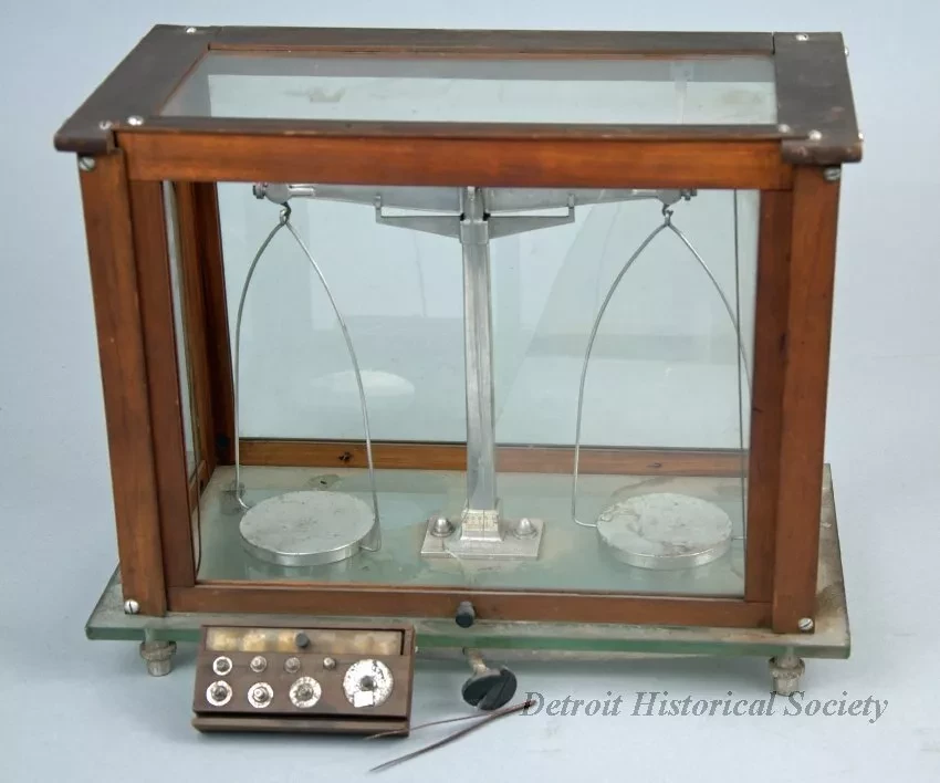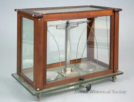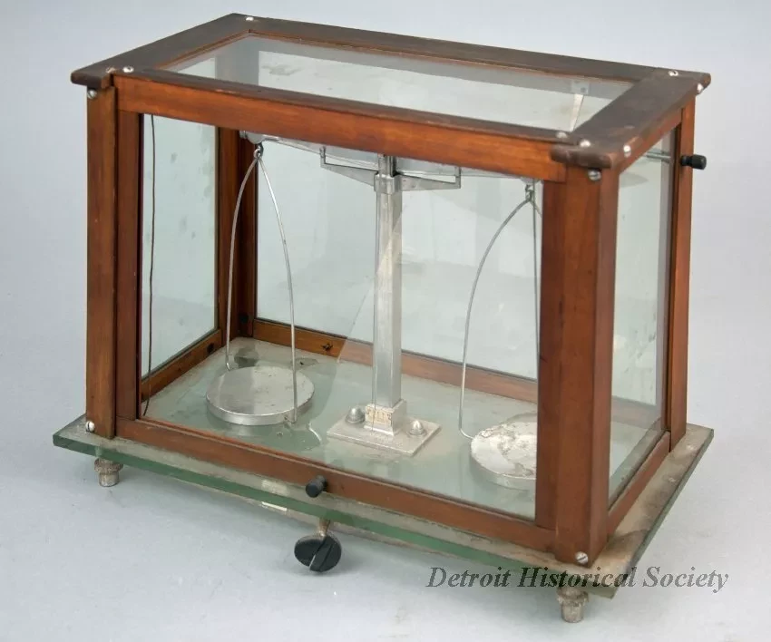 One medical/pharmaceutical balance. The balance is made of aluminum and consists of a central column which supports a balance arm that has circular pans hanging from each end. A long calibration needle is attached at the center of the balance arm and points downward to a graduated scale that is marked on the flange base which holds the central column. Stamped text on the flange reads "Crowell Apparatus Co., Indianapolis, Ind." The flange is bolted to a rectangular clear glass base that has short adjustable screw-type legs at each corner. The entire balance assembly is covered with a rectangular box-type housing which consists of clear glass panels on the sides and top and a wood framework along the edges. The front panel of the housing slides up in order to provide access to the balance. A knurled knob and slide rod on the right side of the housing allows the user to make fine calibration adjustments to weights which may be added on the side of the balance arm which has graduation marks. A black knob screw at the center front side of the glass base allows for adjustment of the height of the center column.