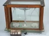 The balance includes a set of weights and tweezers that are contained in a small wooden box. The larger weights are made of cylindrically-shaped pieces of chrome-plated brass that are stamped in 1, 2, 2, 3, 10, 10, 20, and 50 grams. The smaller weights are made of rectangular and other shaped pieces of aluminum or tin that are stamped in 0.5, 0.2, 0.2, 0.1, and 0.05 grams as well 100, 100, and 50 mg.