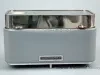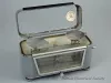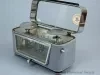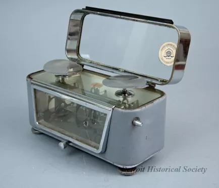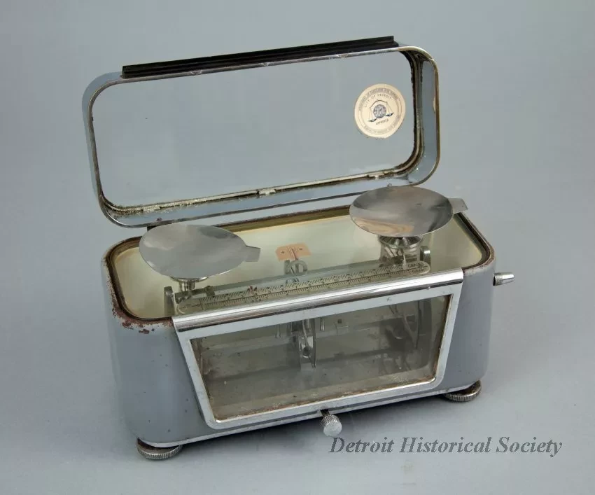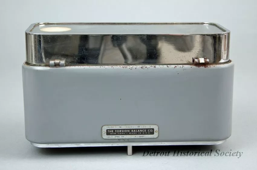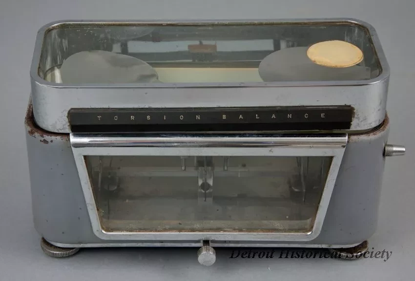 One pharmaceutical torsion balance. The balance case is made of steel that has a gray enamel finish and chrome-plated trim. It has a hinged glass top cover with a chrome-plated steel frame and a large glass window on the front for viewing the balance mechanisms. The top surface of the case (beneath the hinged top cover) is also made of glass to allow for viewing a graduated scale arm which is marked in grains and grams. A knob and slide rod on the right side of the case allows the user to adjust the weight reading on the scale arm. Two metal supports with removable, circular, stainless steel pans are located on the top of the glass surface. A long black plastic handle on the front of the top cover frame has white text that reads "Torsion Balance." A metal adjusting knob for balance calibration is located at the lower front side of the case. The underside of the case has one short fixed leg at the back and adjustable knob screws for legs at each of the front corners. On the lower back side, a rectangular metal label reads "The Torsion Balance Co., New York, Made in U.S.A" and "Style RX-1, No. 13241, Cap. 120 g, Class A." A circular white adhesive inspection label from the "City of Detroit, Bureau of Weight and Measures" is affixed to the glass on the hinged lid.