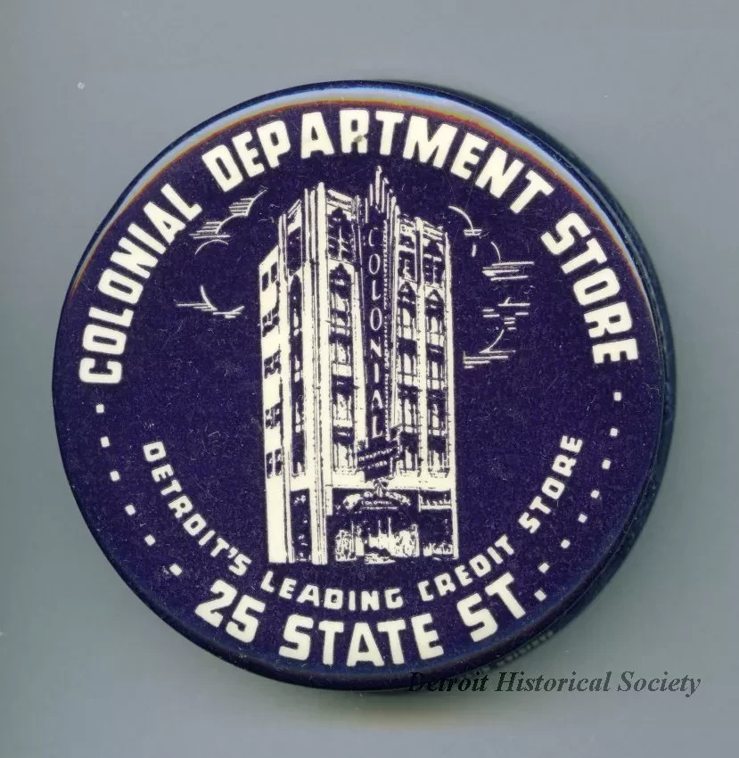 One souvenir bank from the "Colonial Department Store" in downtown Detroit. The pocket-size, puck-shaped bank is made of thin stamped steel back with rounded edges. The top panel has a glossy paper covering which is printed with a blue/white drawing that depicts a front corner view of the decorative six-story store building that was located at 25 State Street. White printed text on a dark blue background reads "Colonial Department Store - Detroit's Leading Credit Store, 25 State Street." The bottom panel of the bank has a matching paper covering which has white printed text on a blue background that reads "Colonial Department Store, 25 State Street," and "10¢ A Day Buys A New Fully Guaranteed Fur Coat," as well as "No Extra Charge for Credit; Two Years Free Cold Storage." The outer edges of both the top and bottom panels are printed with small white text that reads "Parisian Novelty Co., Chicago, Pat. 2-23-1926." The side of the bank is made of a piece of thin chrome-plated steel that has a quarter-size cutout slot. The opposite side has two small rectangular cutouts for insertion of a small tool that would unlock the bank.