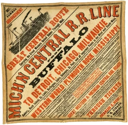 One advertisement banner for the Michigan Central Rail Road Line, "1857 Summer Arrangement - Great Central Route - From Buffalo to Detroit, Chicago, Milwaukie [sic]." The square banner is printed diagonally in black and red text on white silk. An image of the sidewheel steamer, PLYMOUTH ROCK, is shown at the top.
