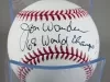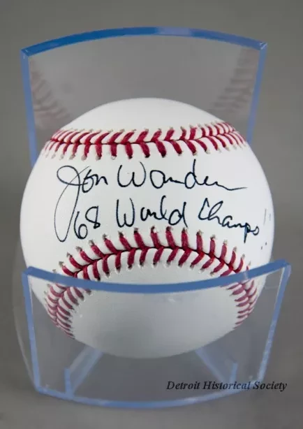 One baseball signed by 1968 Detroit Tigers team member, Jon Warden. The baseball has a white leather exterior with red stitching and is stamped with blue text that reads "Official Major League Baseball, Robert D. Manfred, Jr., Commissioner," and the "Rawlings" logo. Also, a special blue commemorative emblem is stamped on the baseball which has white text that reads "1968 World Series Champions, Detroit Tigers, 50th Anniversary." The baseball has been signed in black ink: "Jon Warden, 68 World Champs!!" It is contained in a fitted clear plastic presentation case. A "Rawlings" logo is stamped near the lower edge on one side of the case along with text that reads "The Mark of a Pro." A Major League Baseball logo is stamped on the opposite side along with text that reads "Authentic Collection," and Official Game Ball of Major League Baseball."