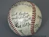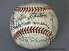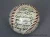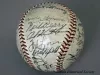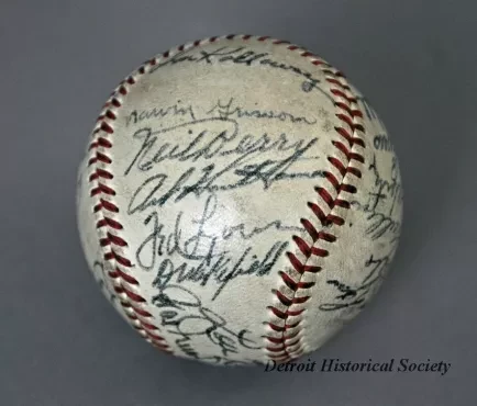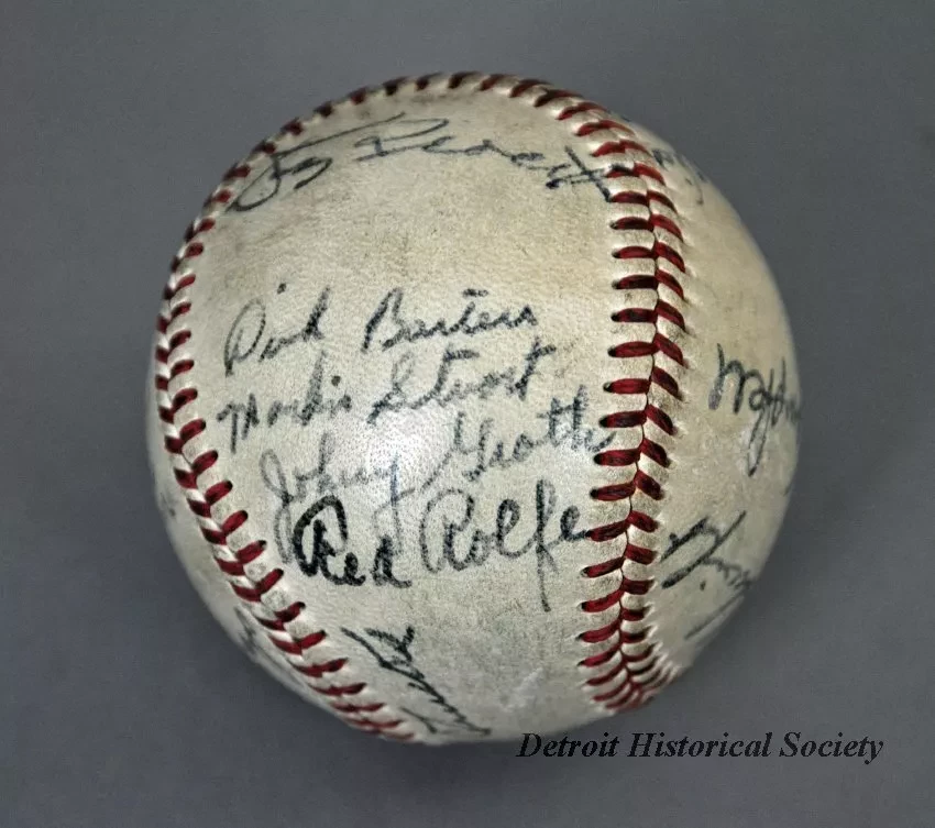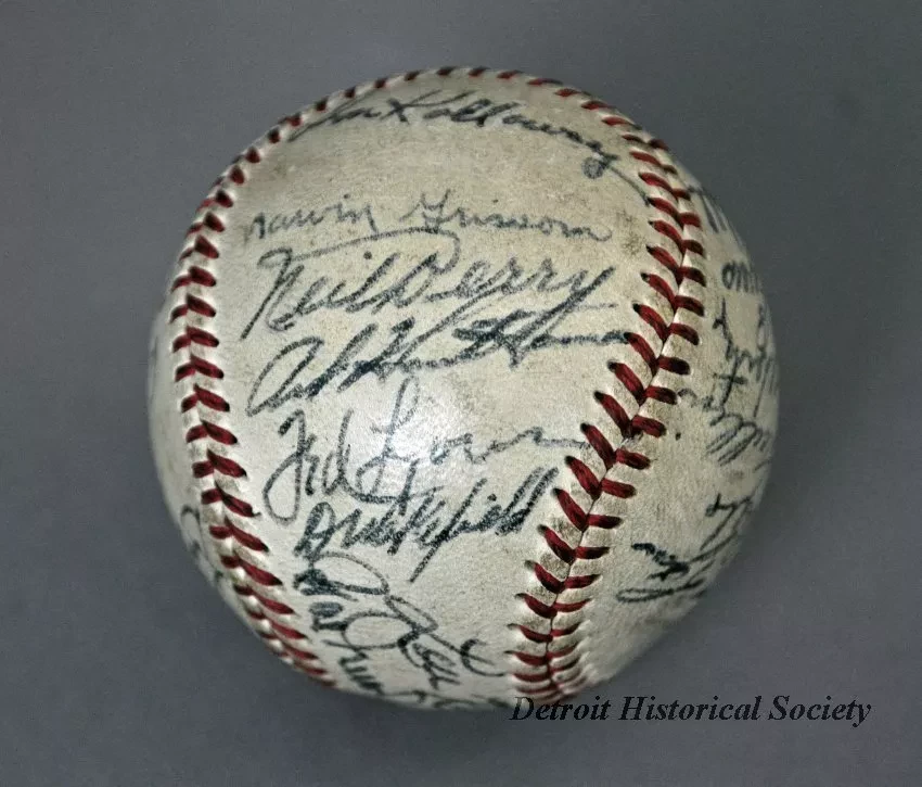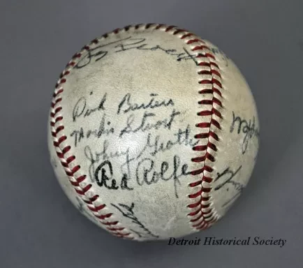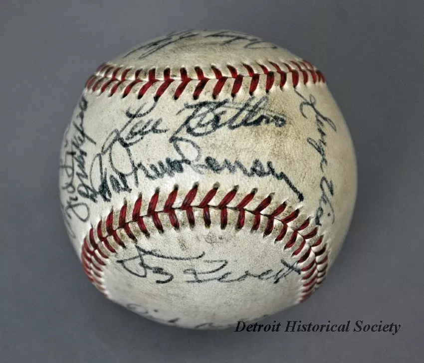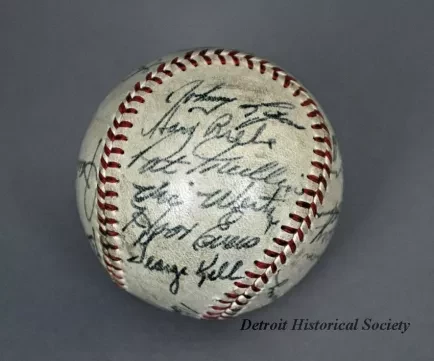 One baseball used in a Detroit Tigers game in 1949. The baseball has a white leather covering and red stitching. It has been signed by 23 team members in black ink and includes the following names: Bob Swift, Paul Campbell, George Vico, Lou Kretlow, Dick Wakefield, Don Kolloway, Neil Berry, Art Houtteman, Marv Grissom, Hal Newhouser, Marlin Stuart, Johnny Groth, Dizzy Trout, Virgil Trucks, Johnny Lipon, Pat Mullin, Vic Wertz, Hoot Evers, George Kell, Hank Riebe, Red Rolfe [team manager], Dick Bartell [team coach], and Ted Lyons [team coach].