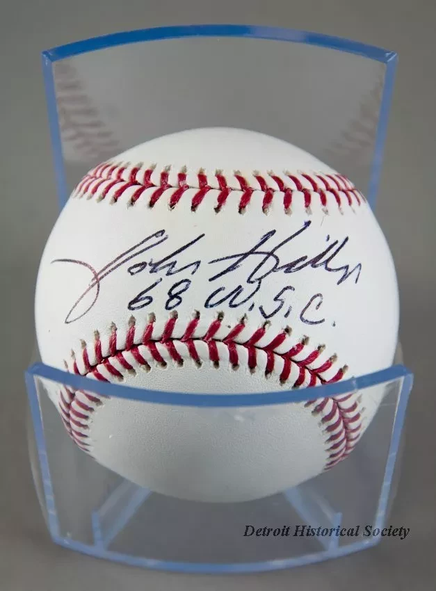One baseball signed by 1968 Detroit Tigers team member, John Hiller. The baseball has a white leather exterior with red stitching and is stamped with blue text that reads "Official Major League Baseball, Robert D. Manfred, Jr., Commissioner," and the "Rawlings" logo. Also, a special blue commemorative emblem is stamped on the baseball which has white text that reads "1968 World Series Champions, Detroit Tigers, 50th Anniversary." The baseball has been signed in black ink: "John Hiller, 68 W.S.C." It is contained in a fitted clear plastic presentation case. A "Rawlings" logo is stamped near the lower edge on one side of the case along with text that reads "The Mark of a Pro." A Major League Baseball logo is stamped on the opposite side along with text that reads "Authentic Collection," and Official Game Ball of Major League Baseball."