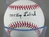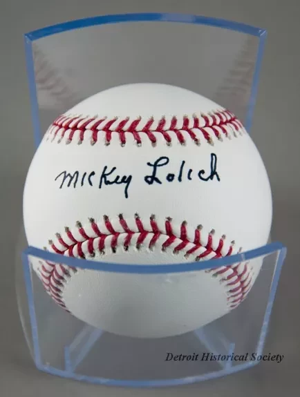 One baseball signed by 1968 Detroit Tigers team member, Mickey Lolich. The baseball has a white leather exterior with red stitching and is stamped with blue text that reads "Official Major League Baseball, Robert D. Manfred, Jr., Commissioner," and the "Rawlings" logo. Also, a special blue commemorative emblem is stamped on the baseball which has white text that reads "1968 World Series Champions, Detroit Tigers, 50th Anniversary." The baseball has been signed in black ink: "Mickey Lolich." It is contained in a fitted clear plastic presentation case. A "Rawlings" logo is stamped near the lower edge on one side of the case along with text that reads "The Mark of a Pro." A Major League Baseball logo is stamped on the opposite side along with text that reads "Authentic Collection," and Official Game Ball of Major League Baseball."