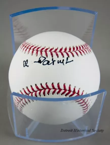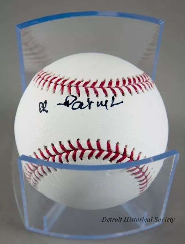 One baseball signed by 1968 Detroit Tigers team member, Daryl Patterson. The baseball has a white leather exterior with red stitching and is stamped with blue text that reads "Official Major League Baseball, Robert D. Manfred, Jr., Commissioner," and the "Rawlings" logo. Also, a special blue commemorative emblem is stamped on the baseball which has white text that reads "1968 World Series Champions, Detroit Tigers, 50th Anniversary." The baseball has been signed in black ink: "Daryl." It is contained in a fitted clear plastic presentation case. A "Rawlings" logo is stamped near the lower edge on one side of the case along with text that reads "The Mark of a Pro." A Major League Baseball logo is stamped on the opposite side along with text that reads "Authentic Collection," and Official Game Ball of Major League Baseball."