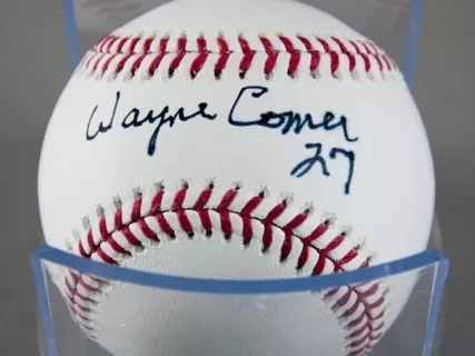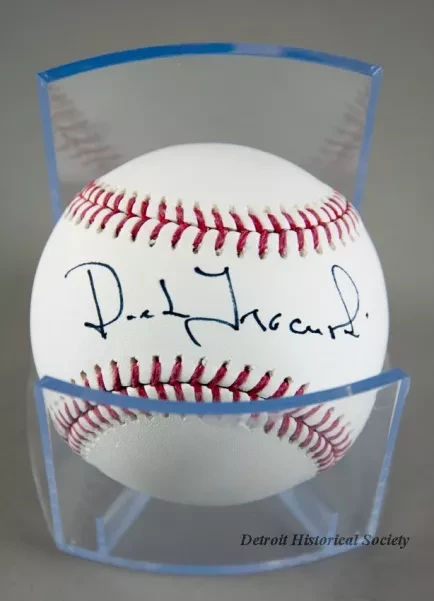 One baseball signed by 1968 Detroit Tigers team member, Dick Tracewski. The baseball has a white leather exterior with red stitching and is stamped with blue text that reads "Official Major League Baseball, Robert D. Manfred, Jr., Commissioner," and the "Rawlings" logo. Also, a special blue commemorative emblem is stamped on the baseball which has white text that reads "1968 World Series Champions, Detroit Tigers, 50th Anniversary." The baseball has been signed in black ink: "Dick Tracewski." It is contained in a fitted clear plastic presentation case. A "Rawlings" logo is stamped near the lower edge on one side of the case along with text that reads "The Mark of a Pro." A Major League Baseball logo is stamped on the opposite side along with text that reads "Authentic Collection," and Official Game Ball of Major League Baseball."