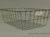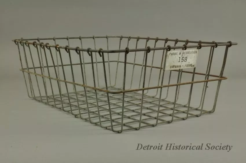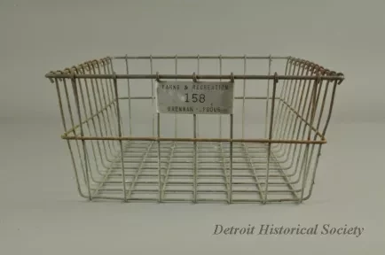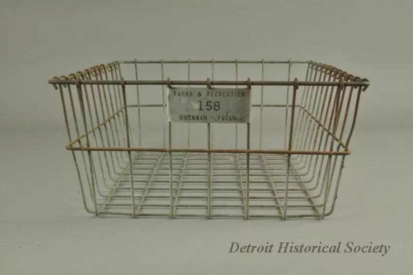 One wire clothes basket. The basket is made of 1/8-inch diameter galvanized steel wire that has been bent and spot welded to form a simple rectangular, open-weave basket. The basket was used for storing clothes in the swimming pool locker room at the Brennan Pool in Rouge Park, Detroit. It has a rectangular metal tag on one end that is stamped "Parks & Recreation, 158, Brennan Pools."
