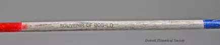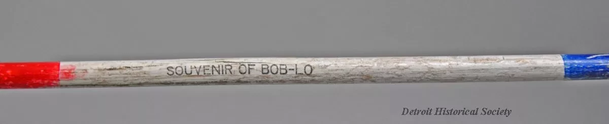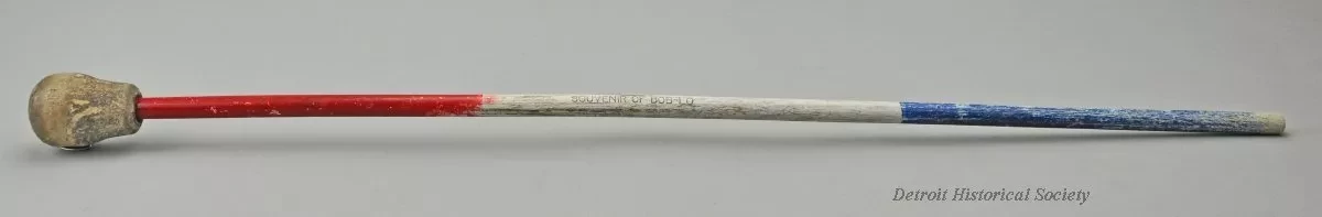 One souvenir baton from Bob-Lo Island. The baton has a wood shaft and a rounded wood knob at one end. The shaft is painted red, white, and blue in three wide bands. Black printed text on the white band at the center section of the shaft reads "Souvenir of Bob-Lo."