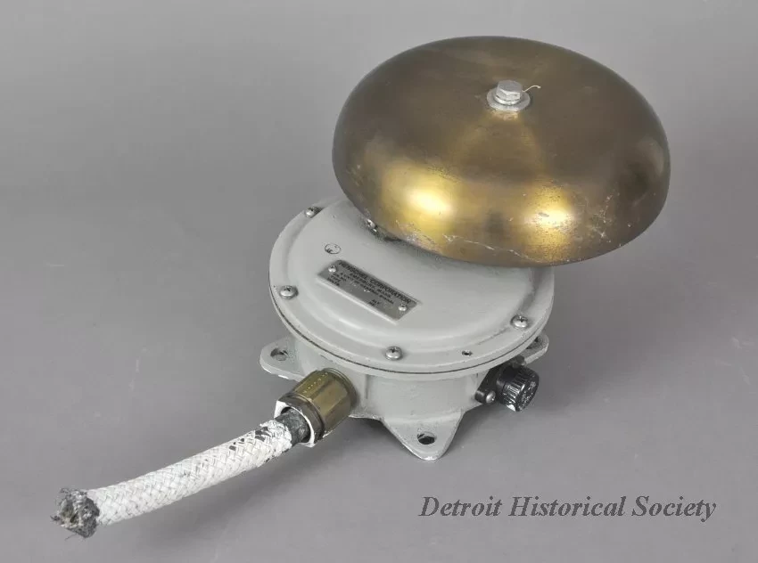 One alarm bell from the SS William Clay Ford. The large round dome-shaped brass bell has a lacquer finish and is electrically-operated. The bell is mounted on a round-shaped, cast bronze watertight housing that is painted gray. A large bronze clapper can be seen at the top of the housing behind the bell dome. An identification plate on the front of the housing shows Henschel Corporation, Amesbury, Mass., A Unit of General Signal." Additional text shows "Dr. No. 20-163-F, Type 8, Volts 12DC, Alt. 13." One screw-type removable fuse cover is located on each side of the housing (left and right) and a brass cable clamp with a short section of heavy-duty electrical cable is located at the bottom of the housing. Four flanges with holes are located at the base of the housing in order to allow the entire bell assembly to be mounted on a bulkhead. The number, "C1297," is cast on the underside of the base housing.