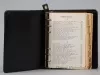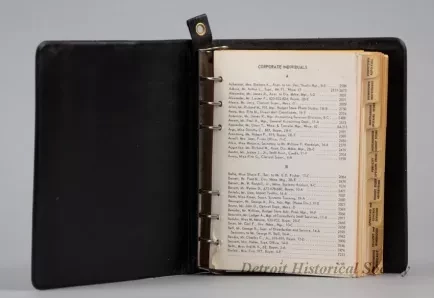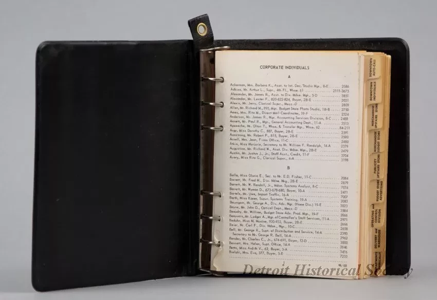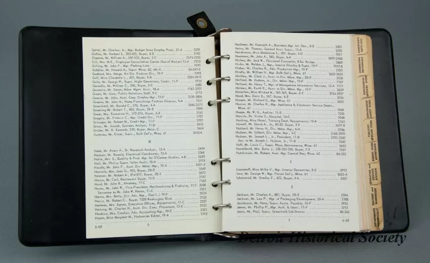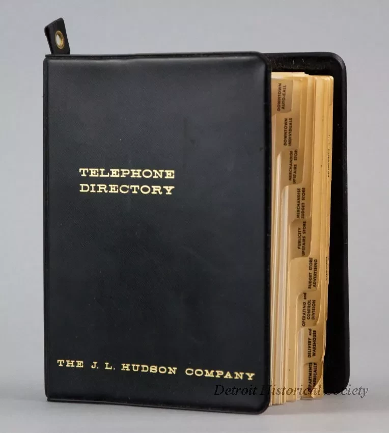 One ring binder entitled "Telephone Directory, The J. L. Hudson Company." The binder has a black vinyl cover with gold-colored title text on the front. It has six metal rings along the inside spine which hold 154 pages of black printed text on white, blue, pale red, and green paper. The names of corporate employees are listed alphabetically by last name at the front of the directory. Divider pages are also included which group departments alphabetically by name for the downtown store and for suburban mall stores. A reinforced vinyl tab with a small metal ring is located at top of the spine so that the directory can be hung on a hook or cord.