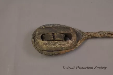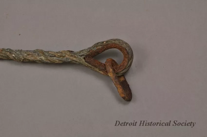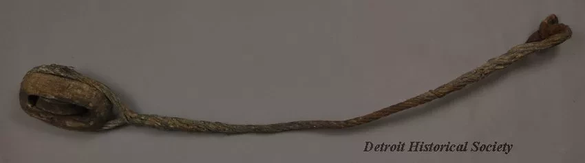 Block: wood with long wire cable or rigid dried rope connected to iron loop and a single link of chain; recovered from wreck of the schooner ALVIN CLARK which foundered in Lake Michigan in 1864.
