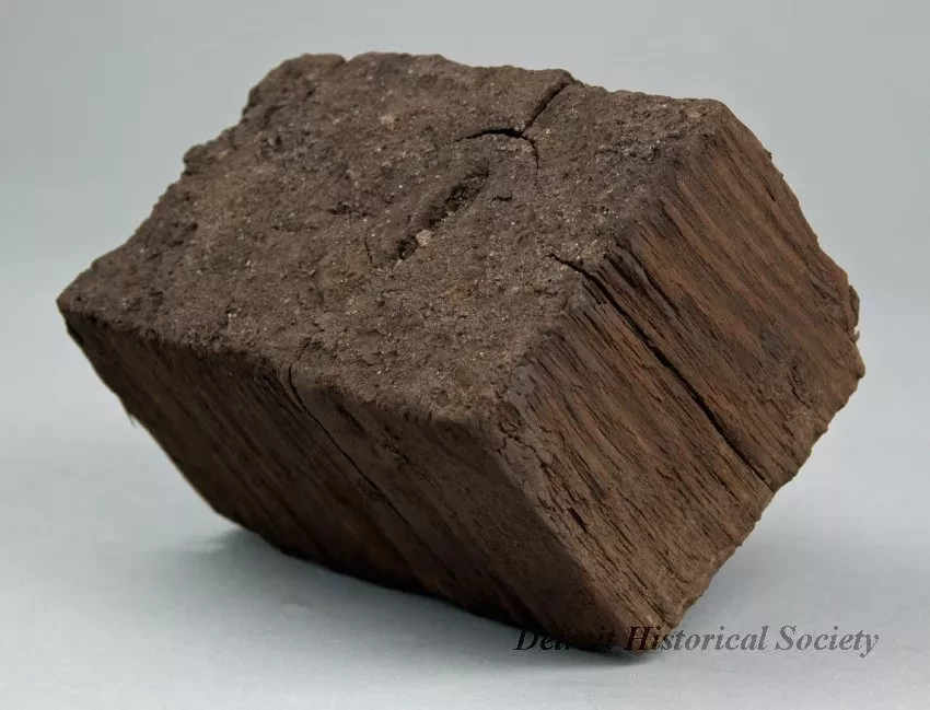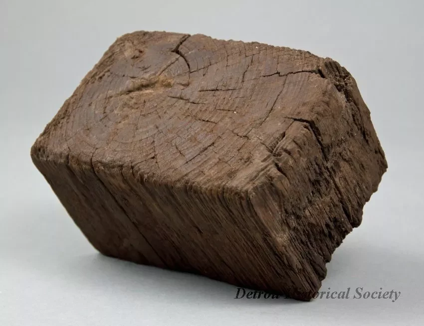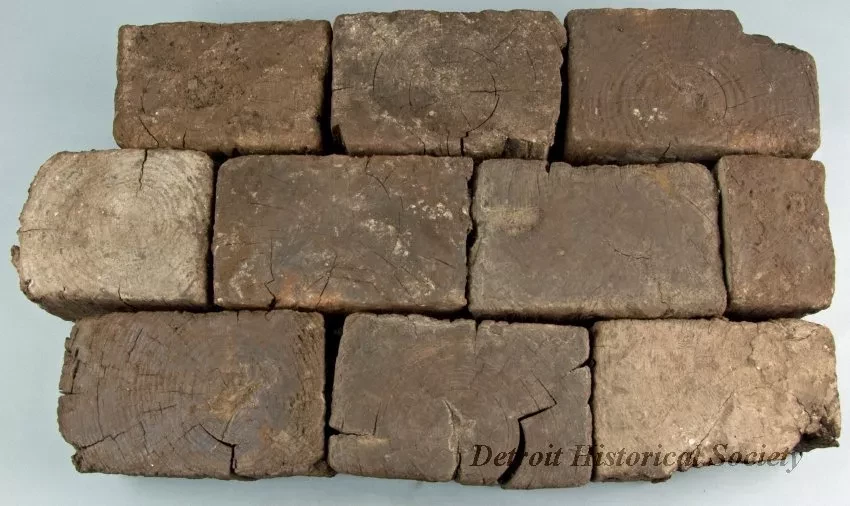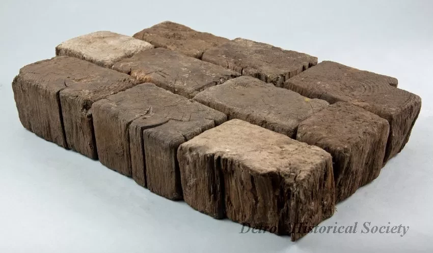 One group of ten wooden paving blocks that were used for pavement construction on Cass Avenue near Forest in Detroit. The blocks are made of wood that have been cut into brick-size pieces and treated with a creosote preservative. The blocks were set in a sand base and fitted together in order to create a paved roadway surface.