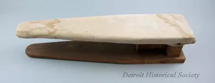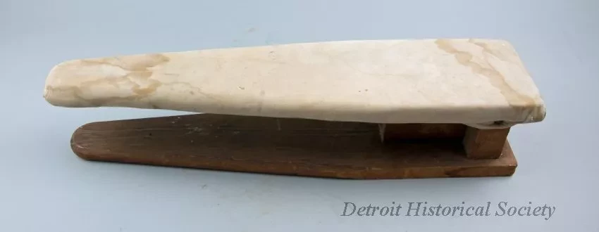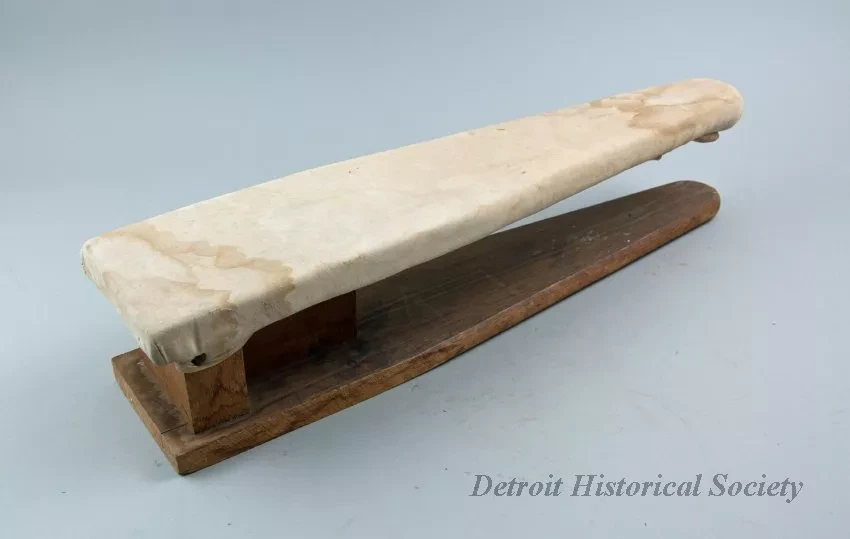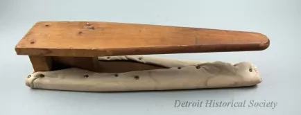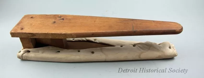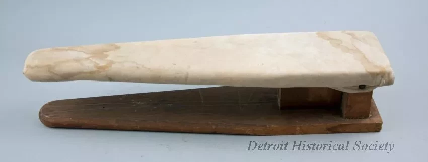 One ironing board for shirt sleeves. Consists of two wood boards with tapered sides that have been rounded at the narrow ends. Boards are separated by a wood block at the wide end. Top board is covered with white padded ironing cloth and is secured on the underside with round head tacks.