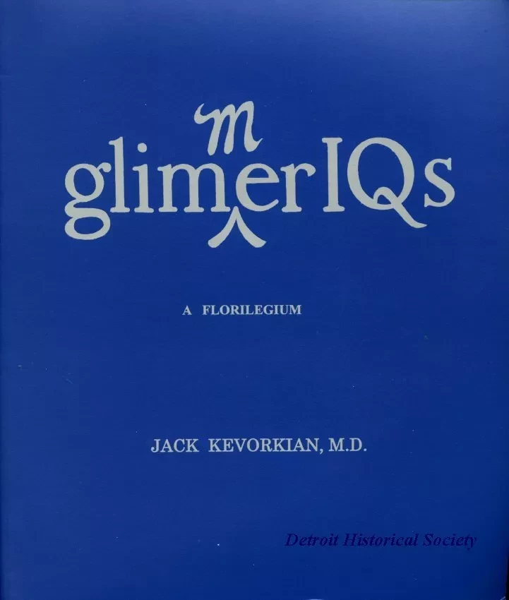 One book entitled "glimmerIQs: A Florilegium" by Dr. Jack Kevorkian. The softcover book has a medium blue cover with light blue text. the book is a collection of short stories, poems, and art which cover a variety of subjects such as life, death, time, and being. Some autobiographical information is shown in the back section. The book contains 277 pages and was printed by Penumbra, Inc., Bloomfield Hills, Michigan, and has a copyright date of 2004.