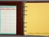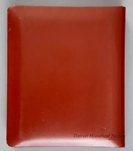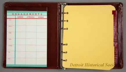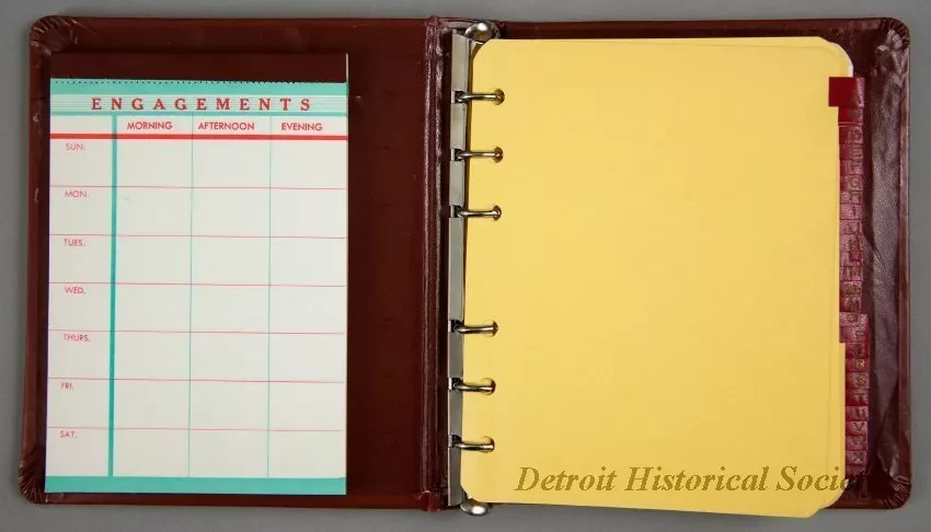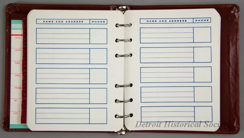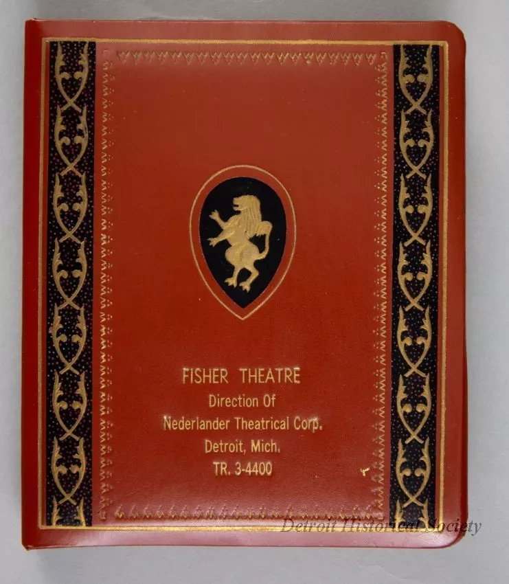One promotional address book/calendar that was given to patrons of the newly-renovated Fisher Theatre on October 1, 1961. The hardcover address book has a brown/maroon simulated leather cover that has decorative gold-colored and black designs along the borders on the front. A small gold-colored rampant lion emblem is shown on a black background at the center. Gold-colored text is stamped near the bottom that reads "Fisher Theatre, Direction of Nederlander Theatrical Corp., Detroit, Mich. TR. 3-4400." The book has a 6-ring metal binder on the inside spine that holds blank address pages and alphabetical divider tab pages. Also, a weekly "Engagements" blank paper pad is held in a pocket on the inside front cover.