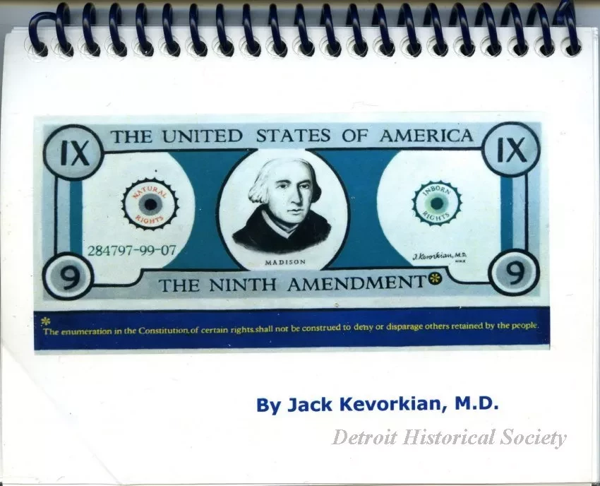 One booklet entitled "Amendment IX: Our Cornucopia of Rights" by Dr. Jack Kevorkian. The spiral-bound softcover book has a blue and white cover with a drawing of a U. S. banknote that features a picture of James Madison. Printed text shows "The United States of America, The Ninth Amendment" and the numerals, "9" and "IX." The booklet also has a clear acetate protective cover and a dark blue paper back cover. The booklet contains red, black, and blue text that gives some history of the ninth Amendment and warns citizens to be wary of rulers who will slowly take away their rights and freedoms in order to increase the power of the state. The book contains 33 pages in length and was printed by Penumbra, Inc., Bloomfield Hills, Michigan.