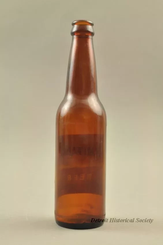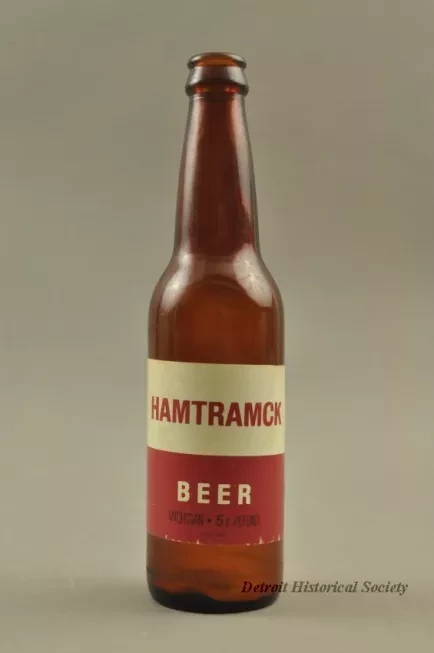 One "Hamtramck Beer" bottle. The long-neck style bottle is made of brown glass. It has a paper label with white/red horizontal stripes and contrasting text that shows "Hamtramck Beer" as well as black text that shows "Michigan, 5¢ Refund, 12 Fl. Oz." and "Great Lakes Brewing Corporation, Ft. Wayne, IN."