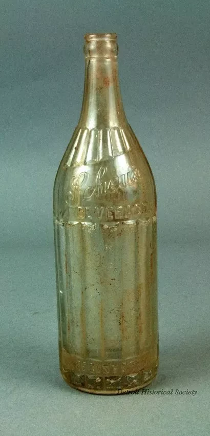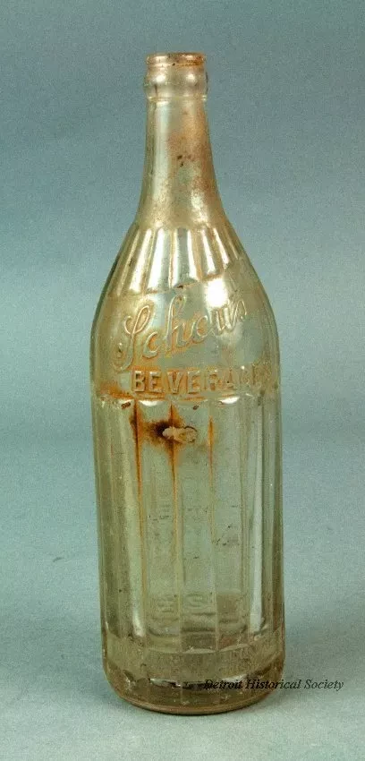 One empty glass beverage bottle. The long neck, quart size bottle is made of clear glass and has raised text on both sides at the base of the neck that shows "Scheu's Beverages." The molded glass bottle has vertical seams on opposite sides and has a decorative pattern of wide vertical bands formed of raised glass around the outside. Additional raised text at the base of the bottle shows "John Scheu & Son, Inc., Detroit, Mich." and "Registered. A large "S" is shown on the bottom of the bottle.
