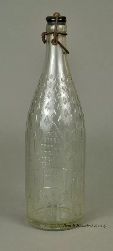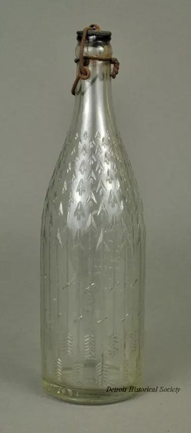 One empty glass beverage bottle. The long neck bottle is made of clear glass and has a large arrowhead design on one side with raised text that shows "Red Arrow Bottling Works, Detroit, Mich., Registered 1 Pt., 8 Fl. Oz." The molded glass bottle has vertical seams on opposite sides and has a decorative raised glass pattern of arrows and arrowheads around the outside. The bottle top has a metal lightning-type closure. (A metal toggle lever and cam action tightens the stopper against the top of the glass.) An arrowhead design of raised glass is located on the bottom of the bottle.
