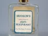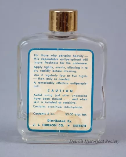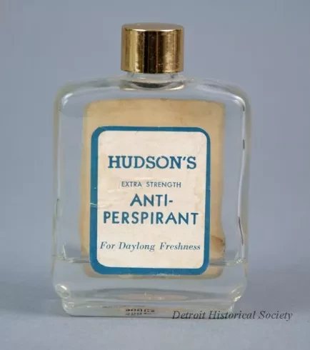 One nearly empty bottle of women's anti-perspirant. The 4-ounce, rectangular-shaped bottle is made of molded clear glass with a gold-colored plastic screw top. A white paper label on the front side has a blue border and text that reads "Hudson's Extra Strength Anti-Perspirant for Daylong Freshness." A similarly styled label on the back of the bottle gives directions and cautions for use. A price of "$3.00 plus tax" is shown.