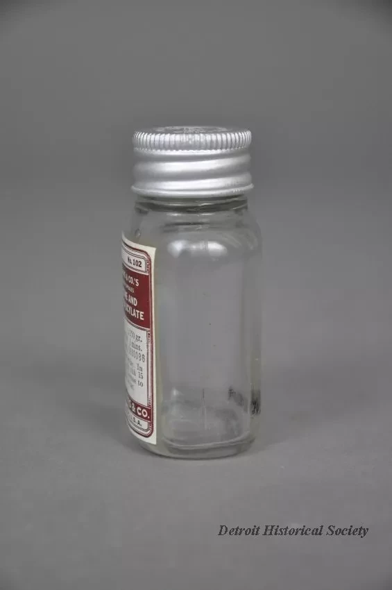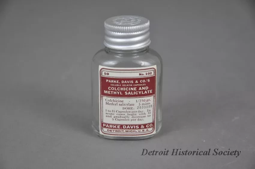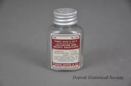 One medicine bottle. The empty bottle is made of clear glass and is rectangular in shape with rounded edges. It has a short neck with a 3/4 inch diameter opening that has an aluminum screw cap. A white paper label on the side has red text that shows "Parke Davis & Co.'s Soluble Gelatin Capsules, Colchicine and Methyl Salicylate." A list of the various chemical components is also shown along with dosage instructions.