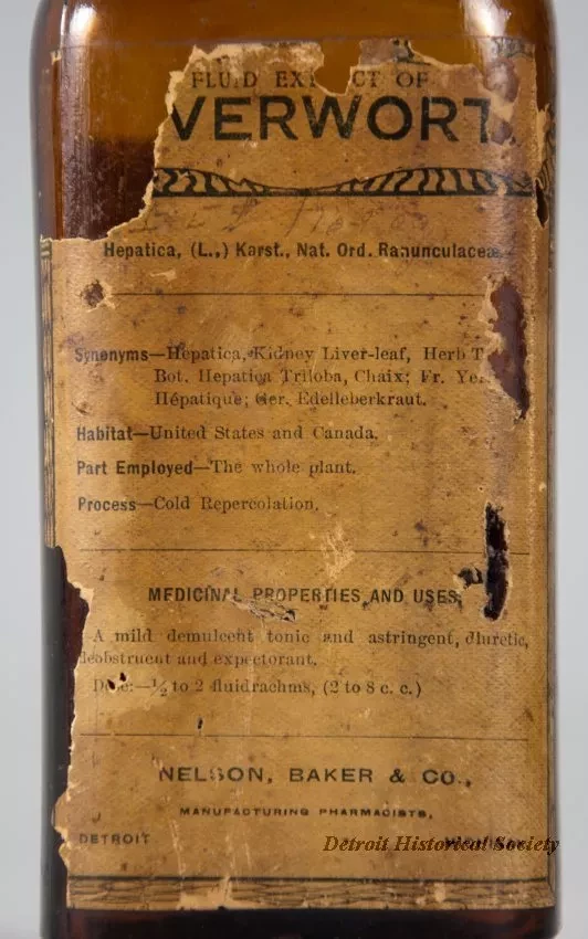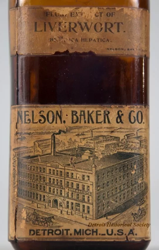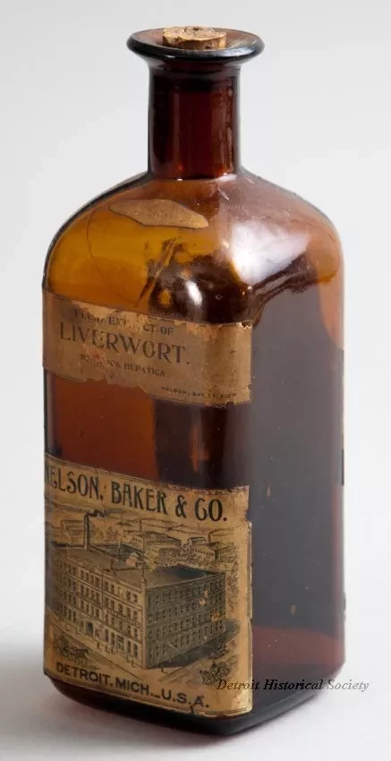 One empty bottle of "Fluid Extract of Liverwort" made by the Nelson, Baker & Co. Manufacturing Pharmacists of Detroit. The tall, square-shaped bottle is made of brown glass. It has a short neck, a wide rim, and a cork stopper. Two adhesive paper labels on the front list the contents and show an engraved image that depicts an elevated, front corner view of the Nelson, Baker & Co. factory. A label on the back of the bottle lists information about the liverwort plant as well as medicinal uses and dosage. Raised text on the underside of the bottle reads "18, N.B. & Co."