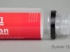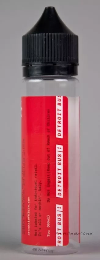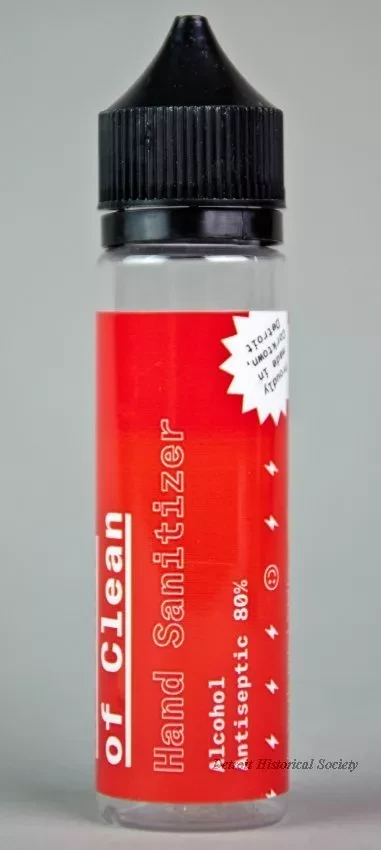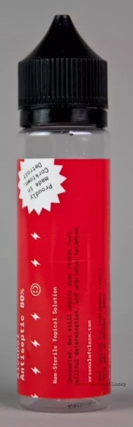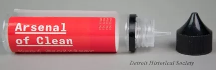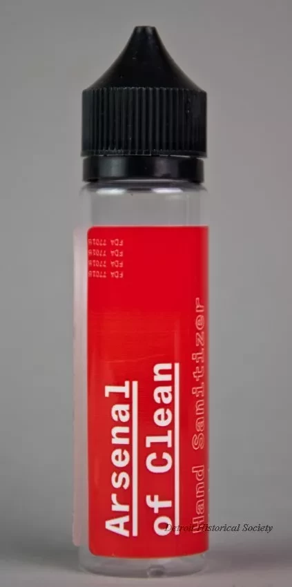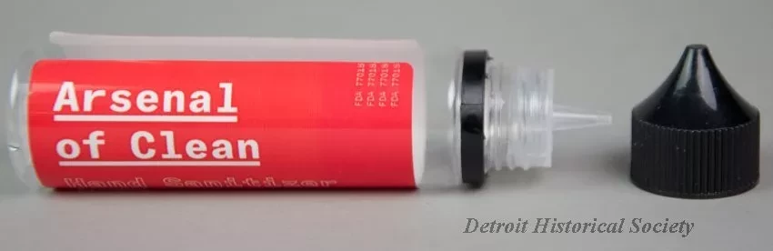 One small bottle (2 oz. / 60 ml) of Arsenal of Clean brand hand sanitizer. The cylindrically-shaped bottle is made of clear plastic and has a removable black plastic screw cap which covers a narrow applicator tip. The bottle contains a clear liquid, alcohol antiseptic solution. A red adhesive label on the side has white and black text that reads "Arsenal of Clean, Hand Sanitizer, Alcohol Antiseptic 80%," and "Non-Sterile Topical Solution; Unscented, but still smells like rocket fuel, willful determination, and unbridled optimism." Additional text reads "Proudly made in Corktown, Detroit," and "arsenalofclean.com, Not labeled for individual retail. It's all or nothin' baby. Do Not Ingest - Keep out of Reach of Children."