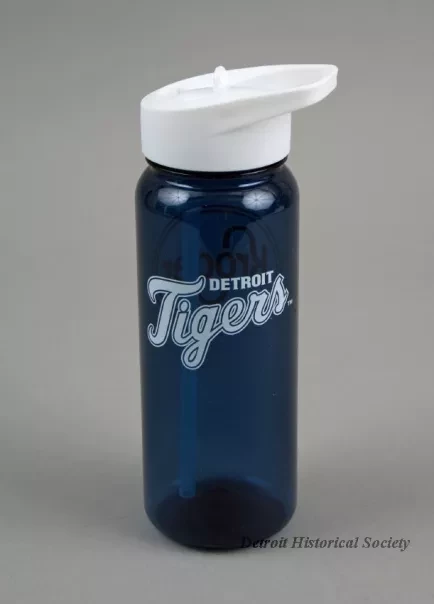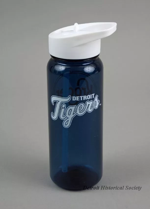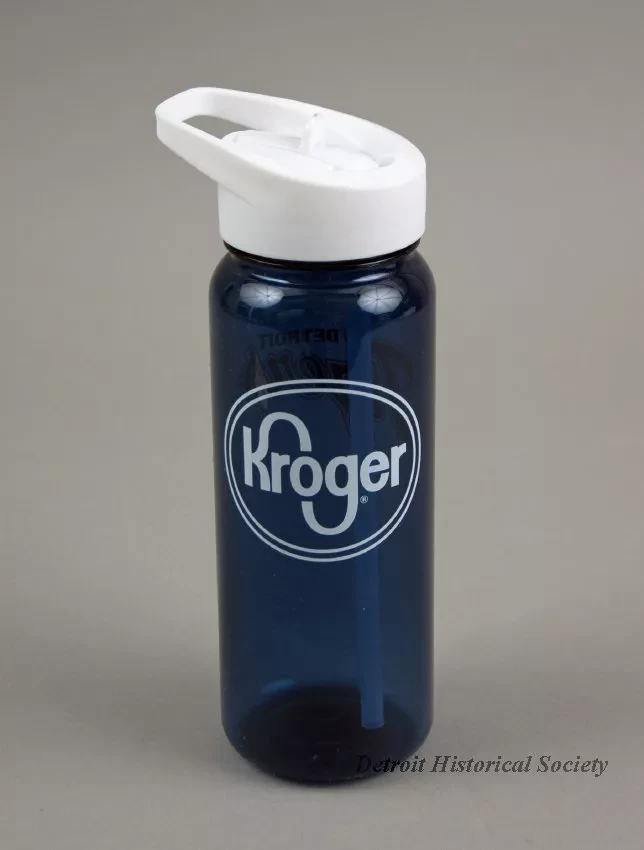 One Detroit Tigers/Kroger water bottle. The cylindrically-shaped bottle is made of dark blue tinted plastic with rounded edges at the top and bottom and a white plastic screw top. The white plastic top has a short, pivoting, straw-like closure at the top surface and a small carrying handle at the side. White painted text on one side of the bottle reads "Detroit Tigers," and a "Kroger" logo is painted in white on the opposite side. Raise text on the bottom of the bottle reads "Hand Wash Only. BPA Free. Made in China." No manufacturer's labels are shown.