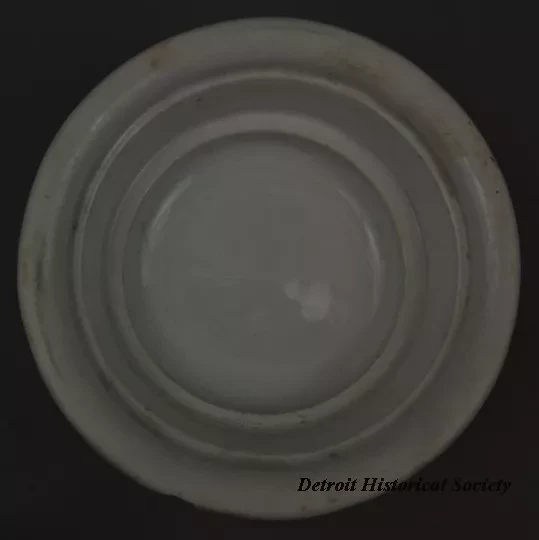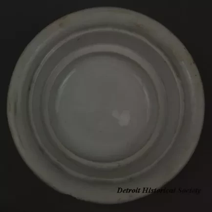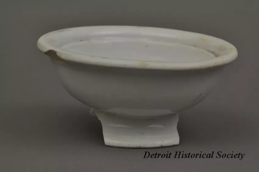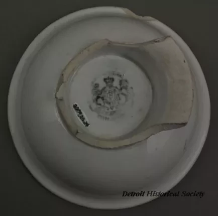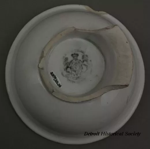 Bowl: white ceramic; missing most of base; interior is stepped into three tiers; faded maker's mark features British Royal Arms with "Stone China" above and the initials "CP" in center; recovered from wreck of the schooner ALVIN CLARK, which foundered in 1864.