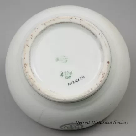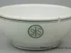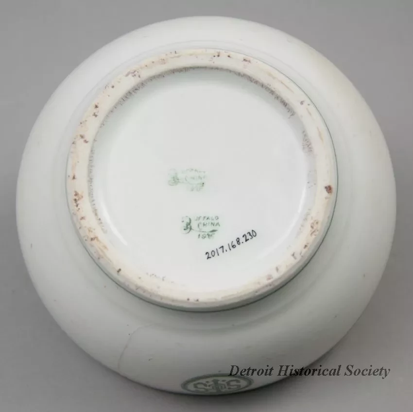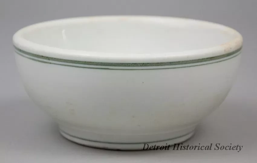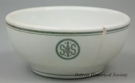 One cereal bowl from the dining room of the bulk carrier, SS Cygnus, of the Interlake Steamship Company (managed by Pickands Mather & Company). The round bowl is made of heavyweight, off-white glazed china. It has a rounded top edge and rounded sides that curve to form a short circular base. Narrow green stripes encircle the outside of the bowl just below the rim and at the base. A circular green logo with the letters "ISS Co. [Interlake Steamship Company]," is stamped on one side of the bowl. The underside is stamped with green text that reads "Buffalo China, 1915."