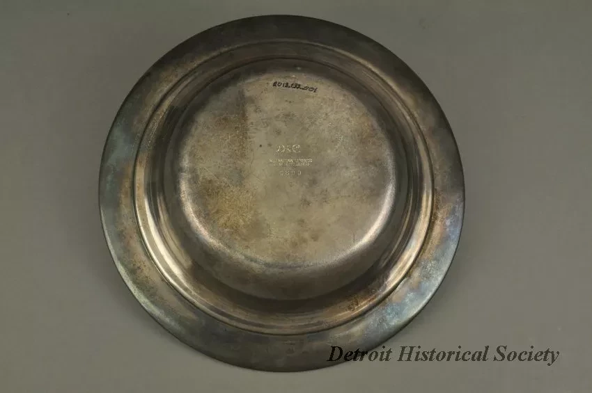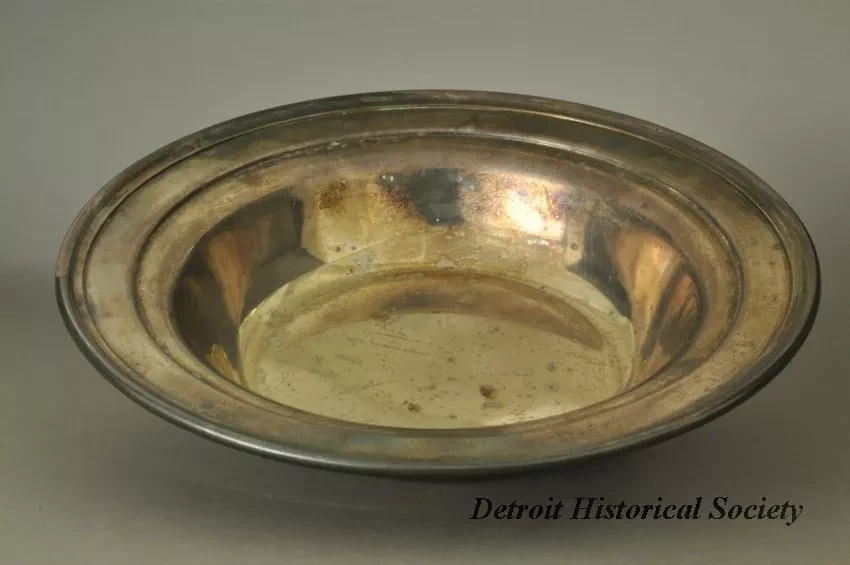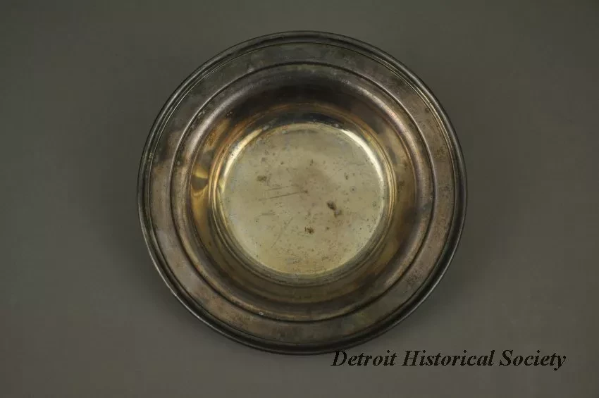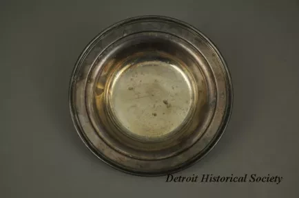 Silver-plated Detroit and Cleveland Navigation Company bowl. The bowl has a 0.875 inch slightly sloped brim. "D&C, International Silver Co. Silver Soldered. 0800. 24.," is stamped on the underside.