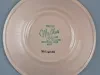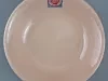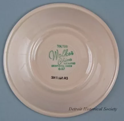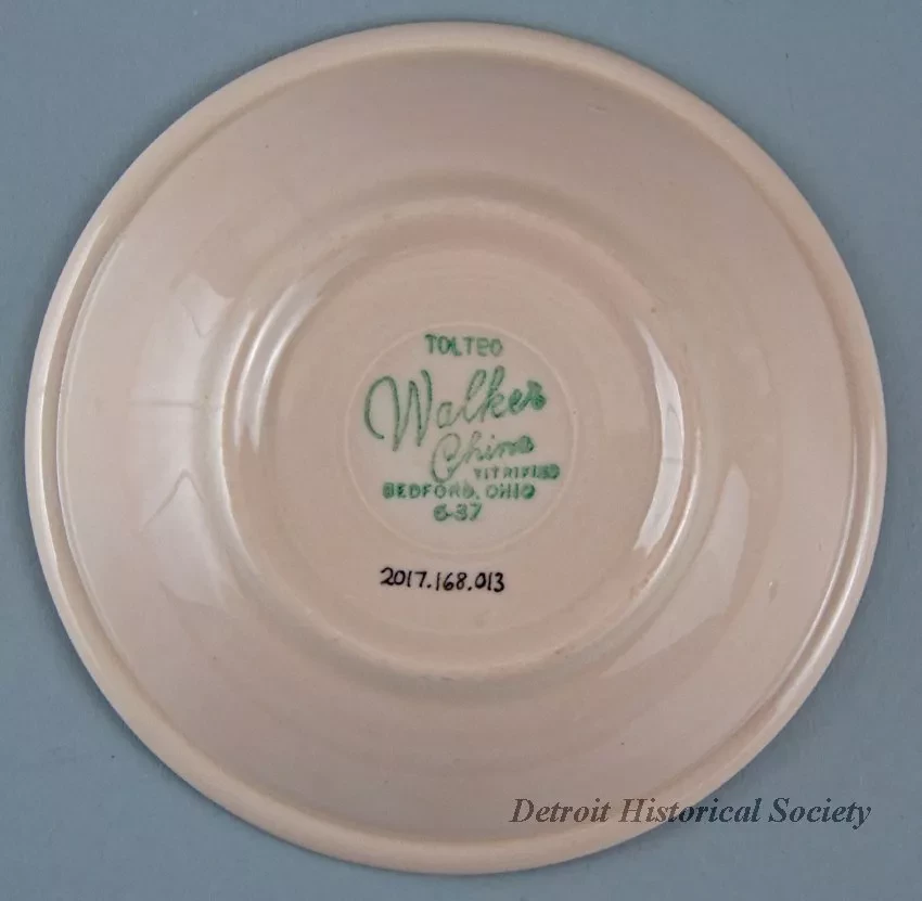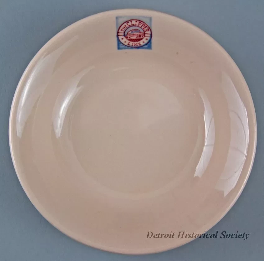 One small fruit bowl from the dining room of the SS MILWAUKEE CLIPPER of The Clipper Line (Michigan & Wisconsin Steamship Company) fleet. The round bowl is made of heavyweight, light tan glazed china. It has slightly curved sides with a rounded outer edge. The square red/tan/blue logo of "The Clipper Line" is shown on the inside near the top edge. The underside is stamped with black text that reads "Toltec, Walker China, Vitrified," and "Bedford, Ohio, 6-37."