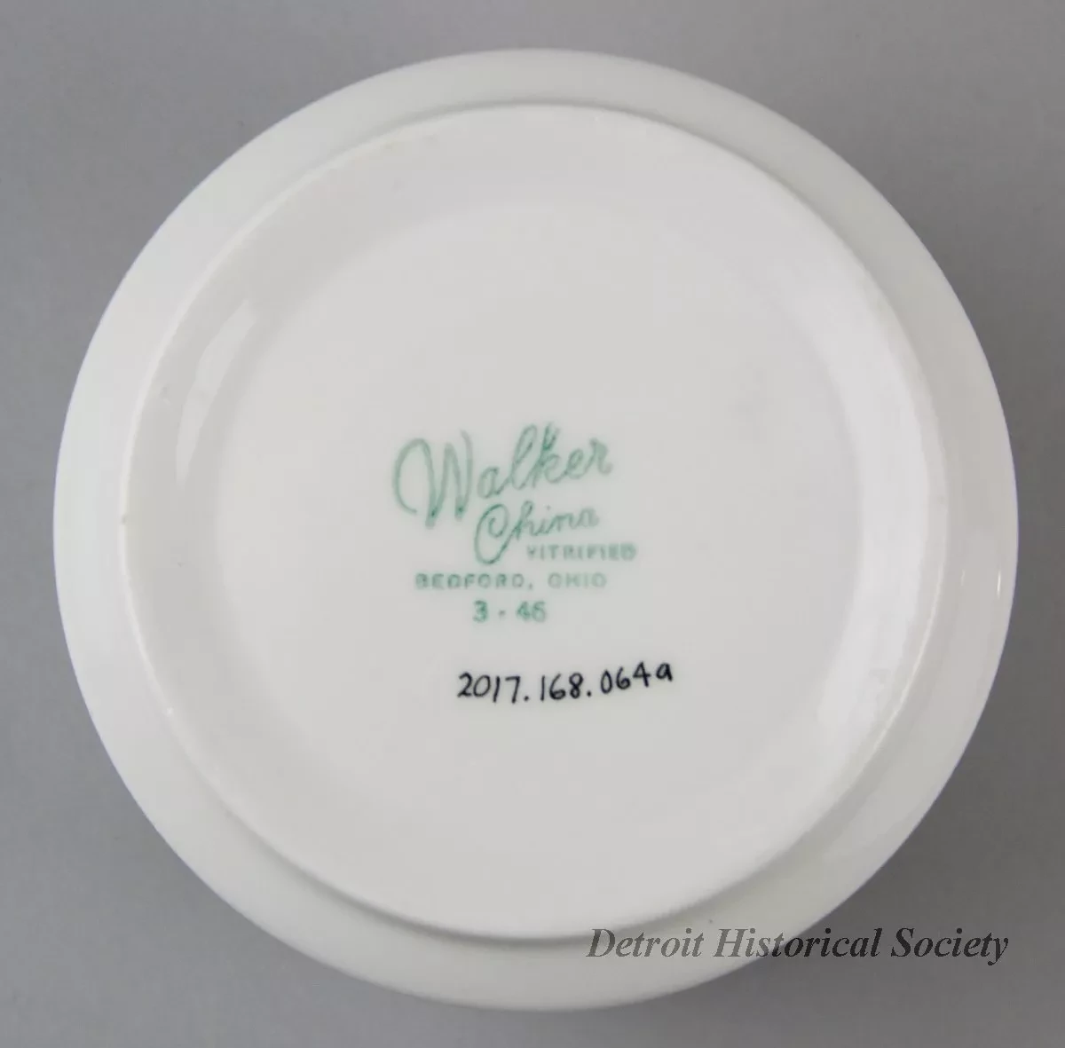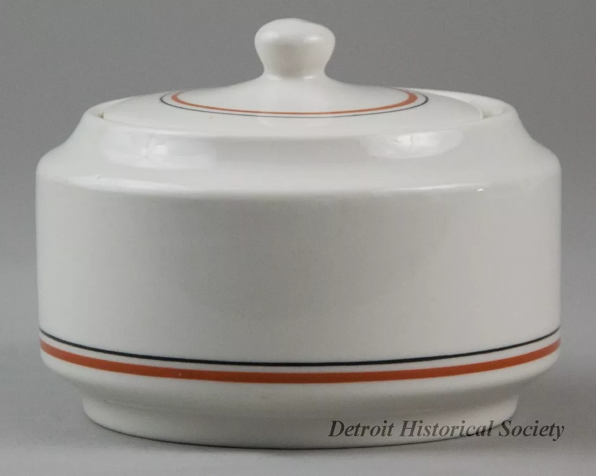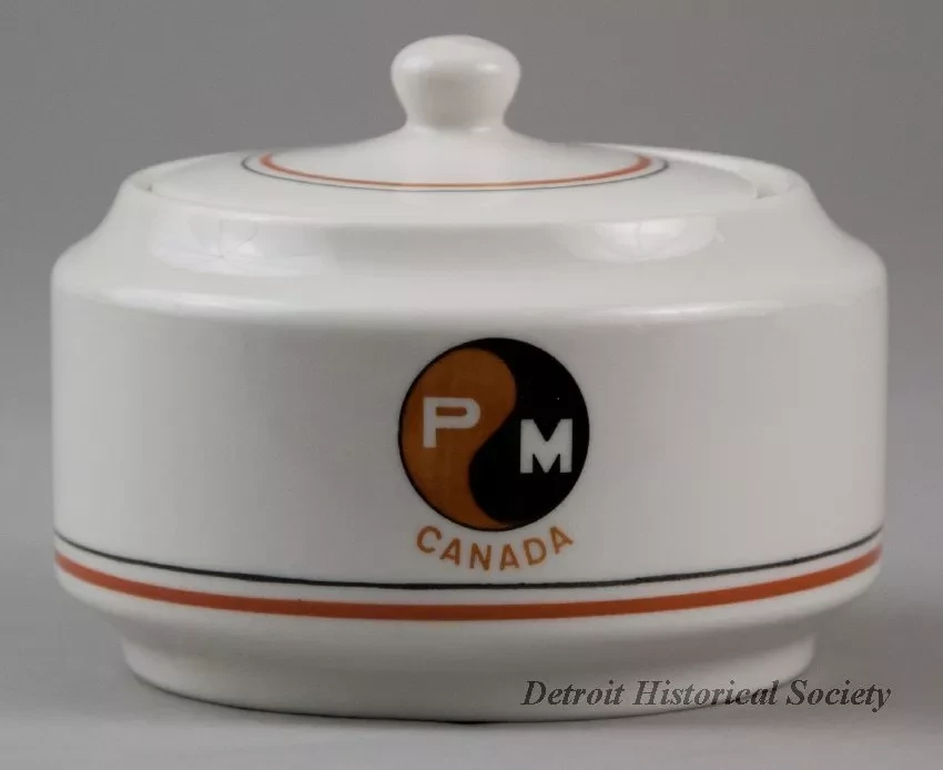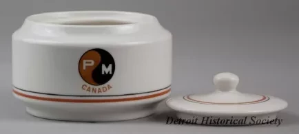 One sugar bowl from a dining room of the Pickands Mather & Company steamship fleet. The circular bowl is made of heavyweight, white glazed china. It has a wide top with a removable lid, a short inward curve at the rim, vertical sides, and a short inward curve at the base. The removable lid has a round knob at the center and narrow black/brown lines that encircle the top at the midpoint between the knob and outer edge. Matching narrow black and brown stripes encircle the sides of the bowl just above the base. One side of the bowl is stamped with the circular, black/brown "PM" company logo with brown text that reads "Canada." The underside is stamped with black text that reads "Walker China, Vitrified," and "Bedford, Ohio, 3-46."