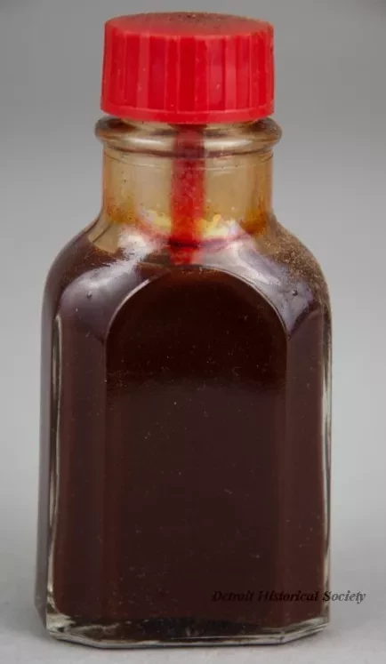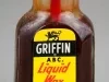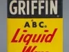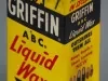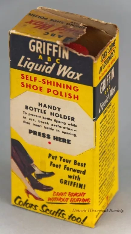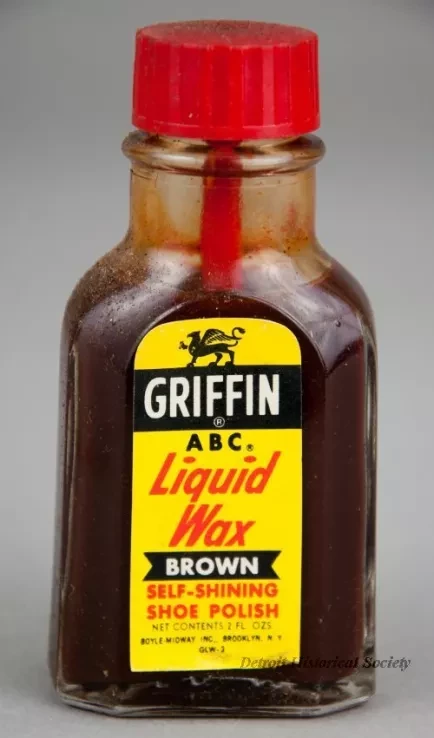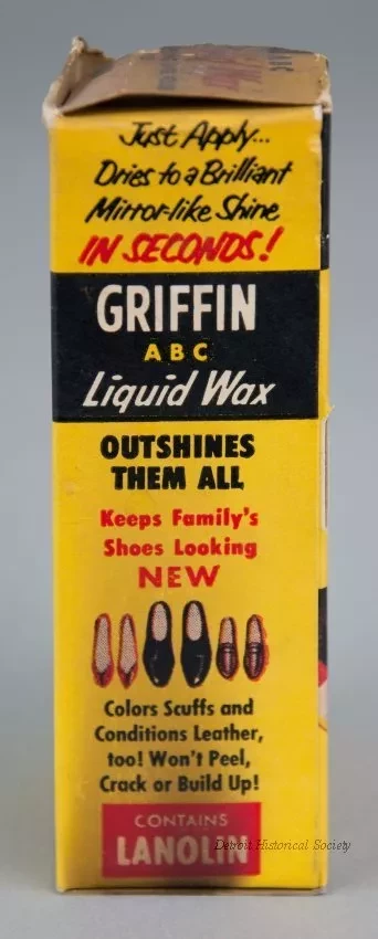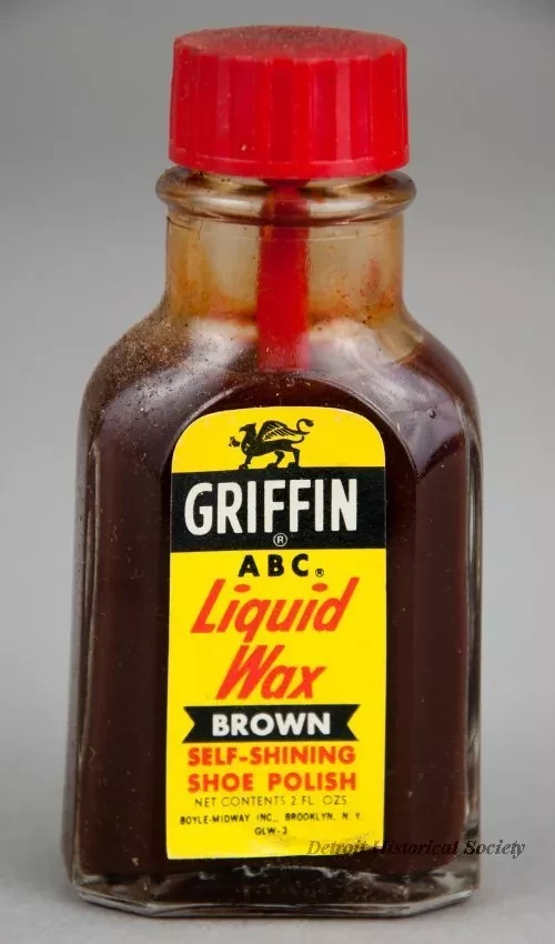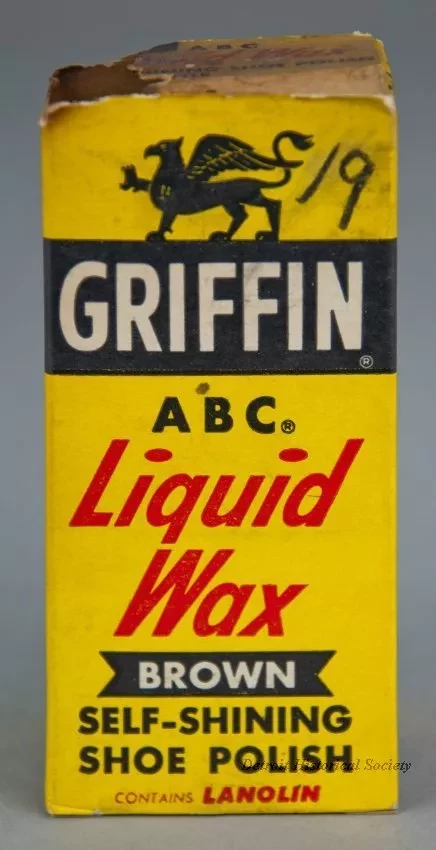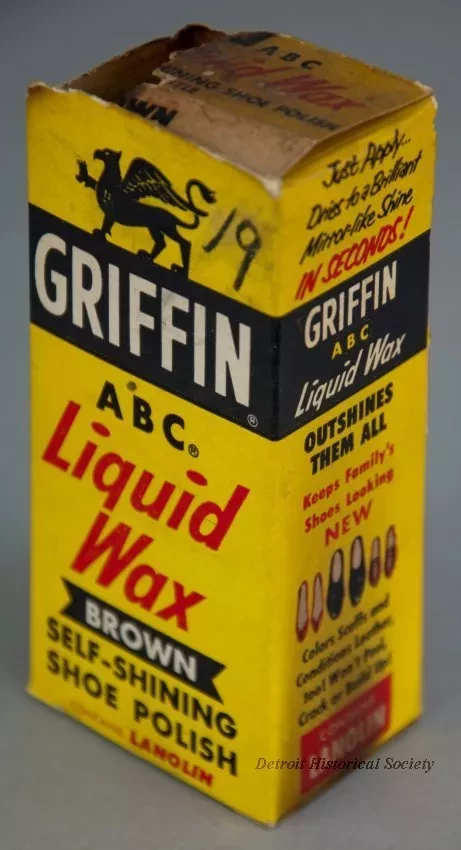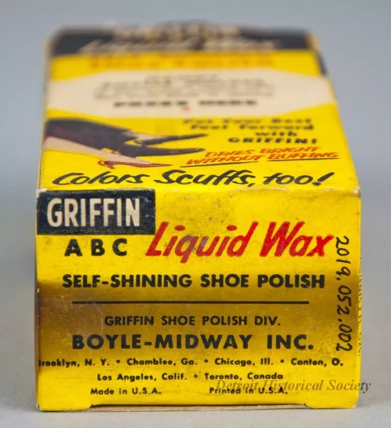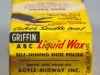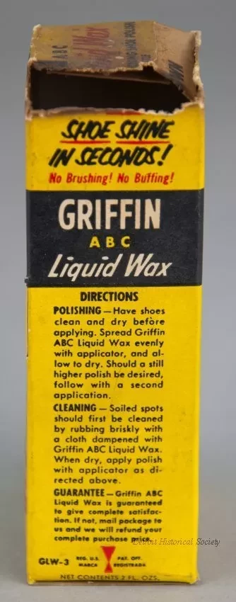 One box of "Griffin Liquid Wax" shoe polish. The polish is contained in a clear glass bottle with a red plastic screw cap. A black/yellow adhesive paper label on one side has red and white text that reads "Griffin ABC Liquid Wax, Brown, Self-Shining Shoe Polish," and "Net Contents 2 Fl. Ozs., Boyle-Midway, Inc., Brooklyn, N.Y., GLW-3." The bottle is held in a cardboard box that has a black/yellow exterior and is printed with red and white text. Application directions are printed on one of the side panels.