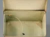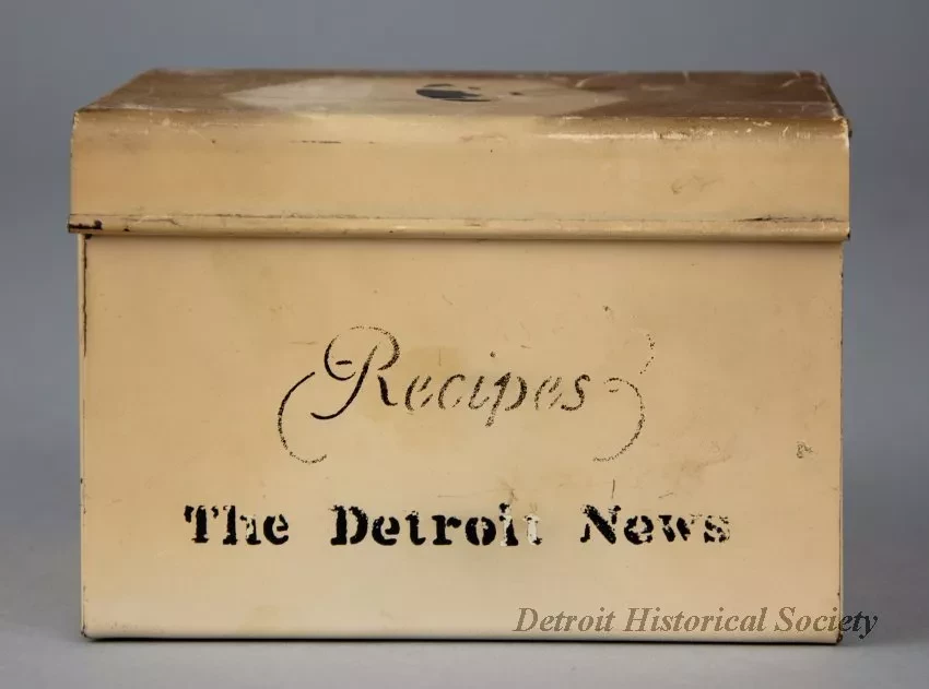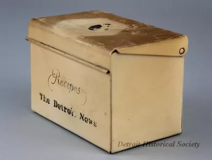One Detroit News recipes box. The rectangular box is made of thin steel which has a tan enamel paint finish. The top is hinged at the back and the front has black painted text that reads "Recipes, The Detroit News." A strip of curved steel is mounted inside the box to provide a spring mechanism for holding recipe cards upright.