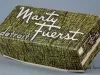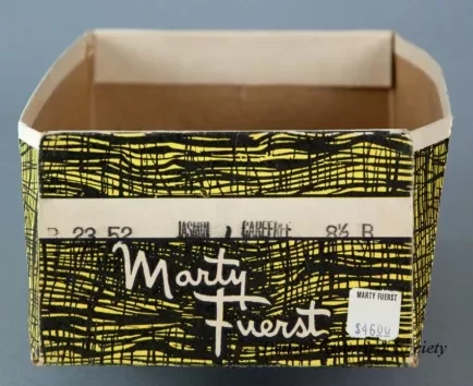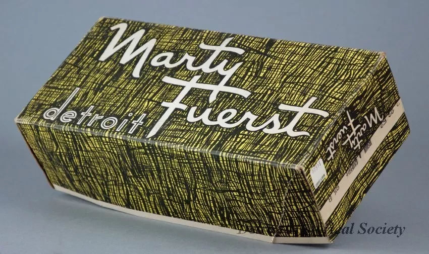 One shoe box from "Marty Fuerst." The rectangular box is made of tan cardboard and has a removable lid. The exterior is printed with a dense yellow/black grass pattern with white text on the ends that reads "Marty Fuerst." The bottom is printed with large white text that reads "Marty Fuerst, Detroit." One end is stamped with black text which indicates the shoe model, color, and size. Black printed text on the inside end of the box reads "The Meyer-Pak Box, Frank C. Meyer Div., Millen Industries, Inc."