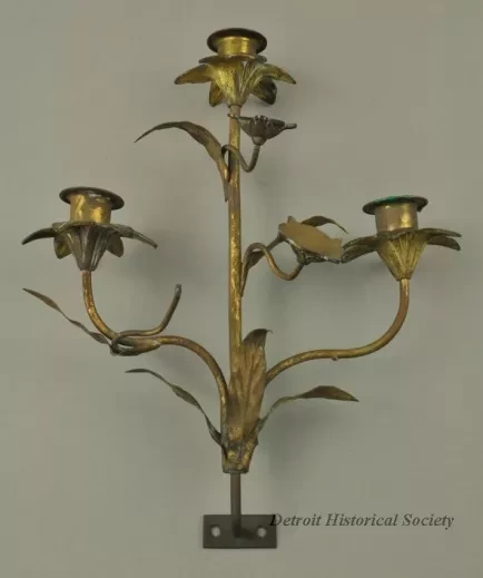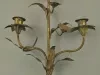 Brass wall bracket candle sconce with three branches decorated with flowers and leaves.
