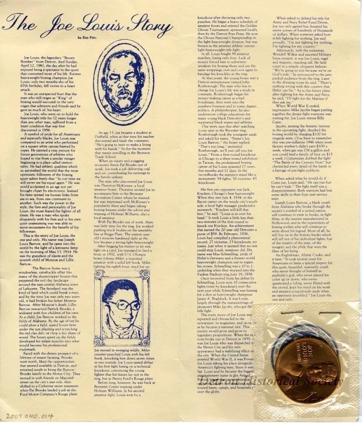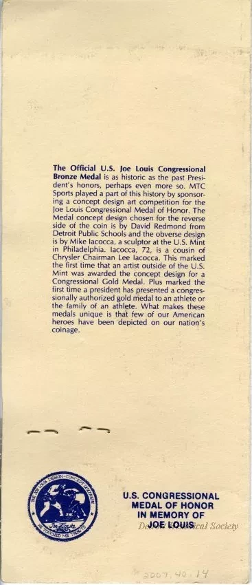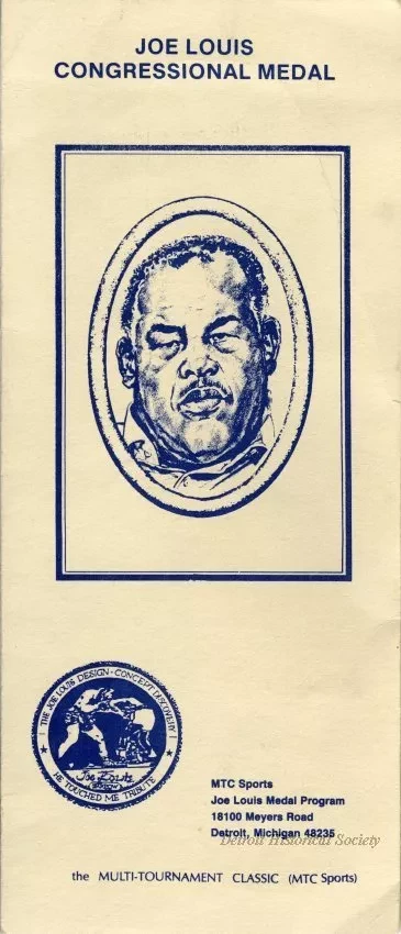 One brochure entitled "Joe Louis Congressional [Gold] Medal." The brochure shows a drawing of Joe Louis on the cover page along with a small circular drawing of two boxers in the lower left corner. In the lower right corner, blue printed text shows "MTC Sports, Joe Louis Medal Program, 18100 Meyers Road, Detroit, Michigan 48235" and "the Multi-Tournament Classic (MTC Sports)." The two inside pages show "The Joe Louis Story" by Ray Pitts which gives biographical information about Joe Louis. A reproduction bronze medal (enclosed in cellophane) is stapled to the inside lower right corner of the brochure. The back page gives a brief discussion of the history of the U.S. Joe Louis Congressional Gold Medal, the design competition, and the designer of the medal.