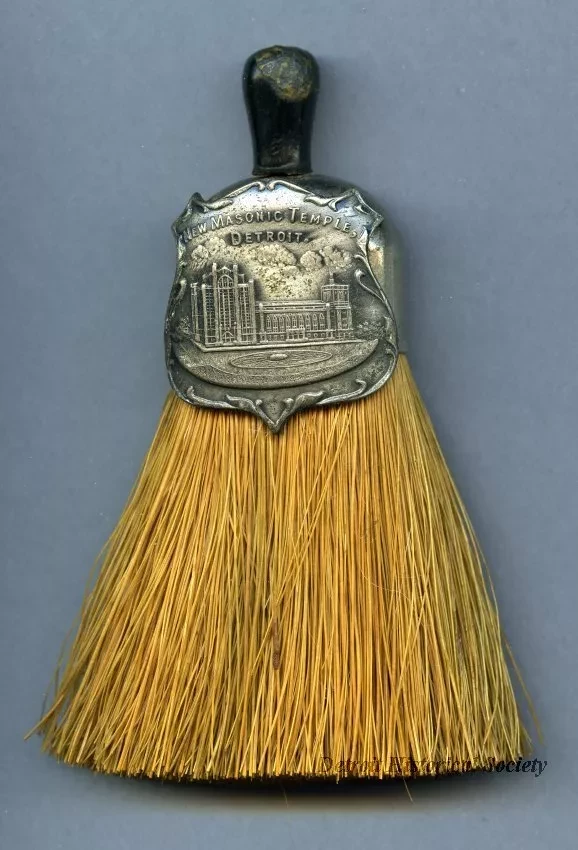 One souvenir miniature whisk broom from the Masonic Temple in Detroit. The broom has a silver-colored stamped metal fitting at the top which holds a bundle of 3-inch long tan bristles (boar bristles?) together to form the broom. A small wood handle is located at the top of fitting and a shield-shaped metal emblem is attached to the side. The emblem shows an image of the Masonic Temple along with text that reads "New Masonic Temple, Detroit." No manufacturer's label or marks are visible.