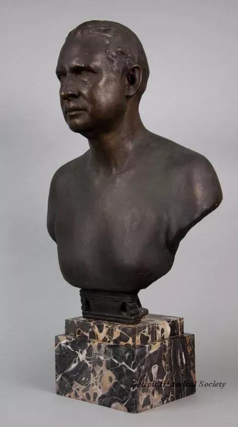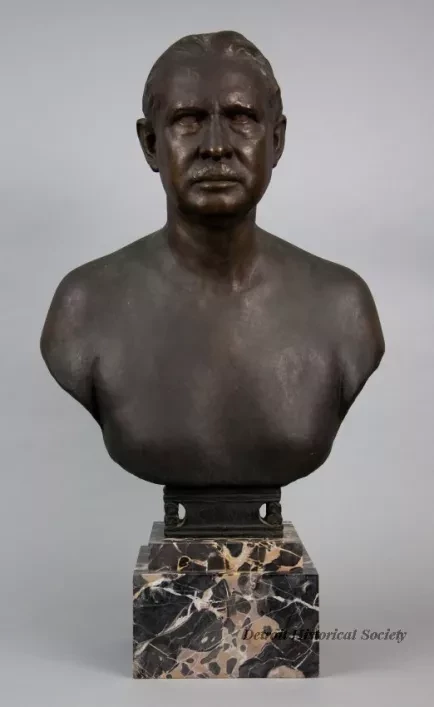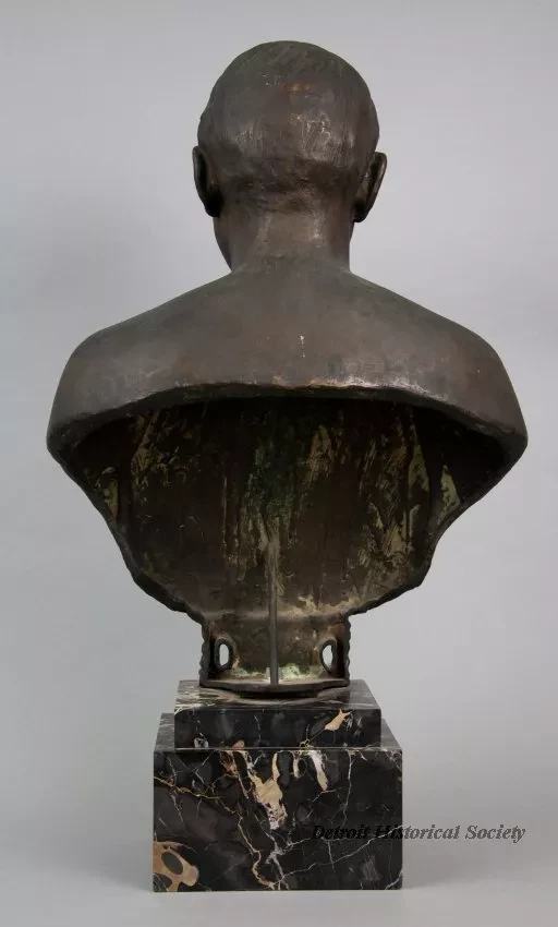 One bronze bust of Clarence Mott Woolley by sculptor, Rudulph Evans. The bust is approximately life-size and shows a chest length, front view of Mr. Woolley as an older man (about age 66). A decorative rectangular plate at the lower edge of the bust shows the initials, "CMW." The bust is mounted on a two-level, square-shaped base of Egyptian marble.