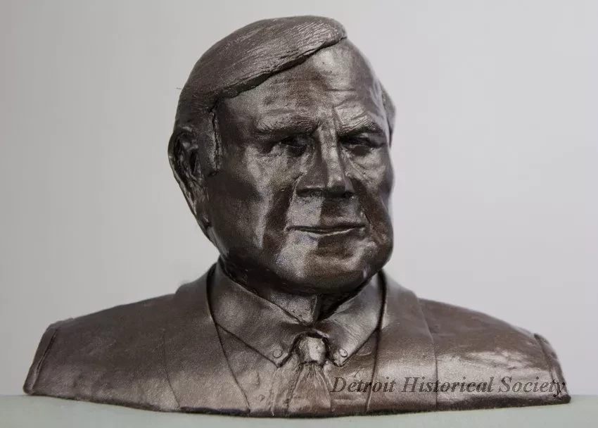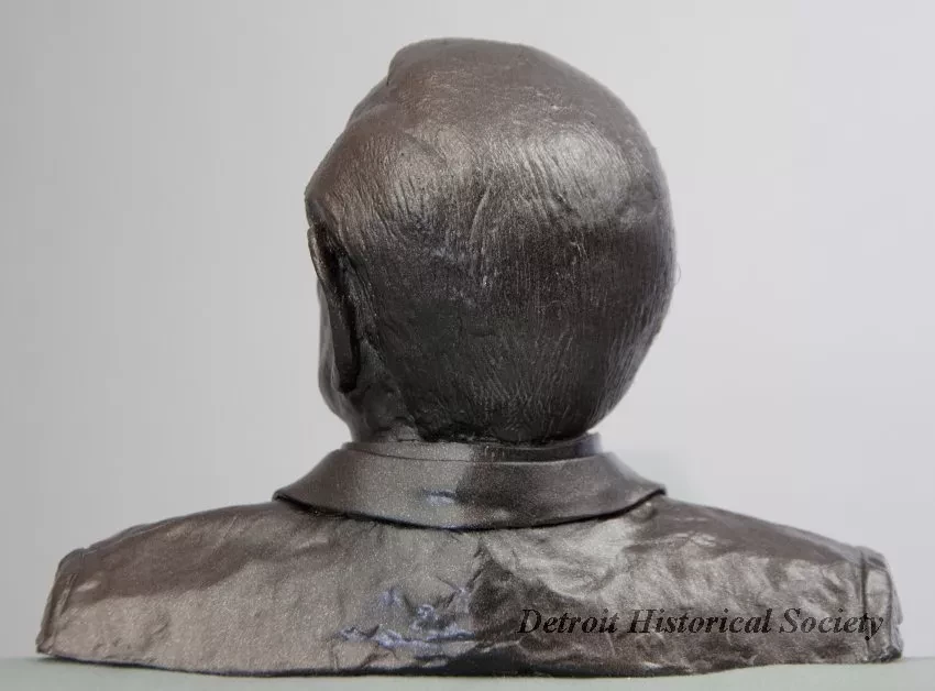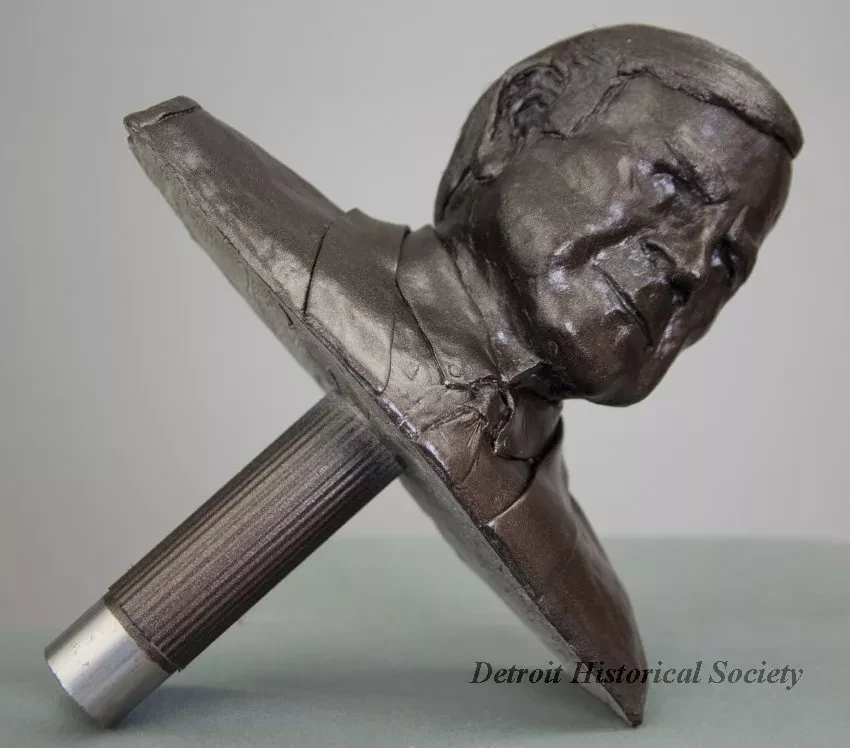 One small plaster bust of Leonard Slatkin, who was the music director of the Detroit Symphony Orchestra from 2008 to 2018. The bust shows a head and shoulders, front view of the subject as a middle-aged man. He is wearing a shirt, a tie, and a suit jacket. The bust is finished with a spray enamel metallic bronze paint. The sculptor, Joel Stone, has inscribed his name, "J. Stone, 2019, Slatkin," on the underside of the bust which is mounted on a vertical 1-inch diameter aluminum tube handle that has a bronze finish.
